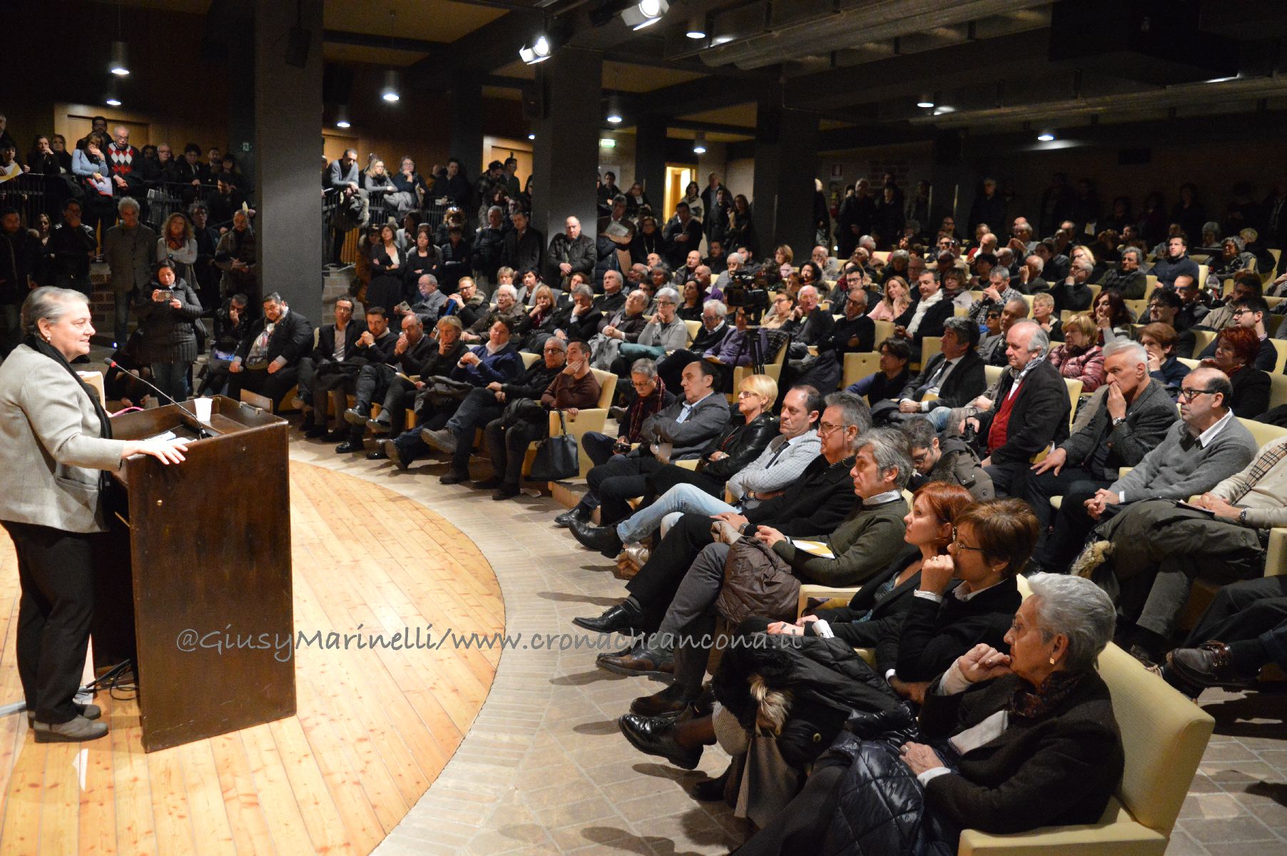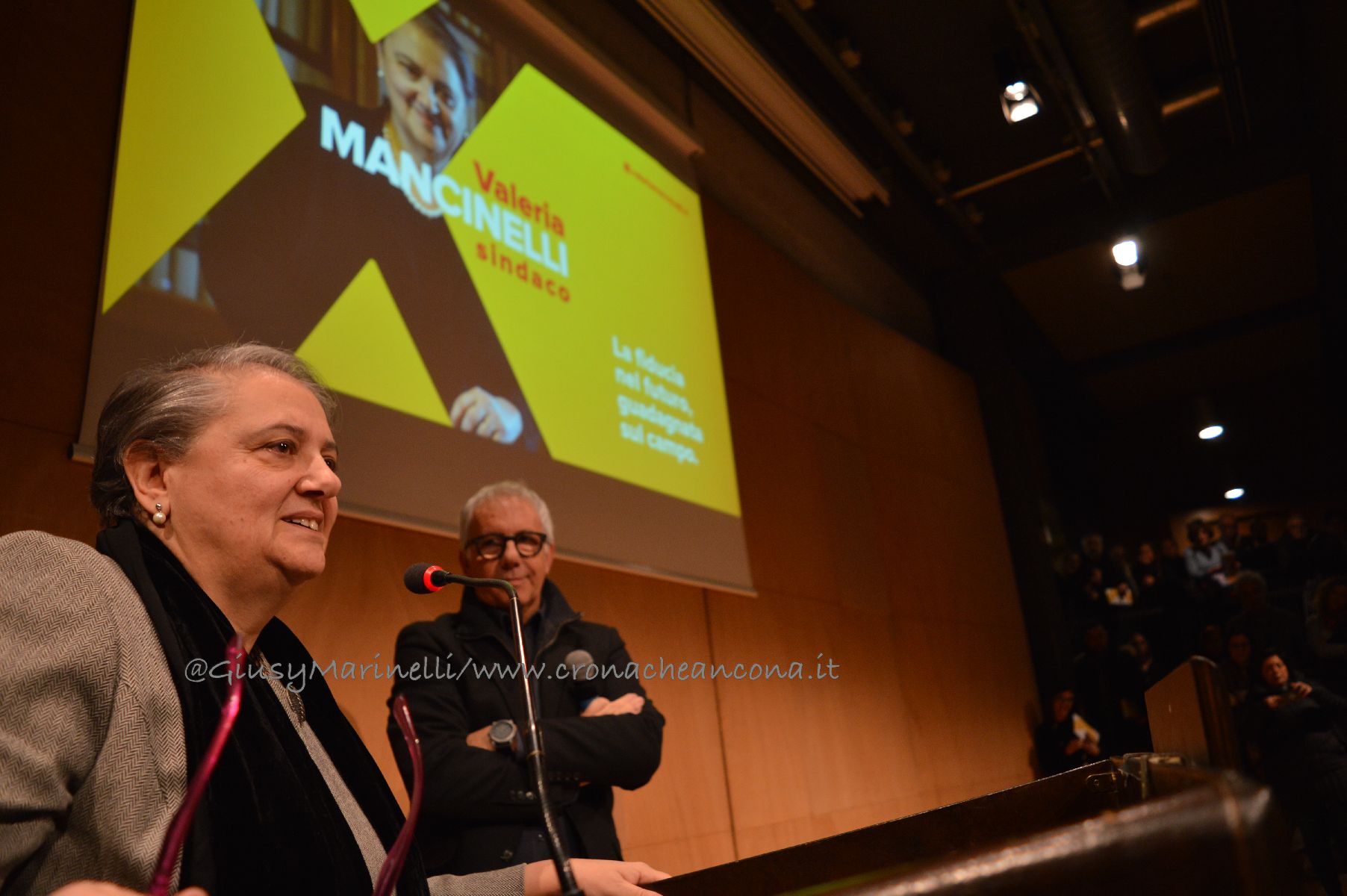 Nessun simbolo di partito esposto, ma tutti presenti i protagonisti di questo primo mandato Mancinelli: i consiglieri comunali di maggioranza, gli assessori, i segretari di partito del centrosinistra. Il sindaco li ringrazia tutti, uno per uno, per aver permesso i successi del primo mandato, dicendosi convinta che in larga parte “saranno le stesse persone dei prossimi cinque anni, la stessa grande squadra”. E’ un sindaco che ha puntato soprattutto su continuità e civismo per presentare la sua candidatura alle prossime elezioni comunali di maggio. Si parte dunque dai suoi “testimonial” anconetani: sono cento gli esponenti della società civile che in due giorni hanno già firmato il suo manifesto-appello intitolato “per Ancona”. Tutti presenti stamane in sala in un ridotto delle Muse pieno con tante persone in piedi, dove spiccano tra gli altri il direttore di Torrette Michele Caporossi, il direttore Area Vasta Maurizio Bevilacqua, l’ex sindaco Sturani, Moreno Clementi, Mario Campanella della Mb, il presidente Prometeo Marco Gnocchini, i candidati al Parlamento e deputati uscenti del Pd Piergiorgio Carrescia e Emanuele Lodolini, nelle retrovie si affaccia anche l’avvocato ed ex candidato sindaco forzista Maurizio Barbieri, che insieme a Mancinelli sta trattando con Ubi la questione delle incompiute di Coop Casa Marche a Pietrlacroce.