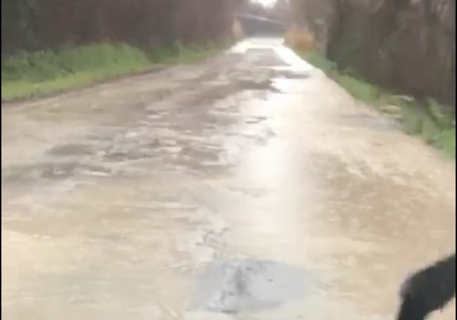 Dannati di via Saline, la riapertura dopo anni del ponte sul fosso San Sebastiano non migliora la condizione della viabilità per i residenti delle frazioni ed in particolare quelli di Paterno e Casine di Paterno. Via Saline resta un campo minato di voragini e crateri, con la pioggia battente degli ultimi giorni la strada si è letteralmente allagata rendendo molto difficile il transito tra Ancona e Falconara. Uno dei residenti delle frazioni ha documentato il tutto con un video denuncia. “Questa è la situazione e vedremo cosa succederà con la neve dei prossimi giorni” commenta il residente. La situazione si trascina da anni, la strada che collega le frazioni di Ancona con Castelferretti è stata distrutta durante i lavori di ampliamento della A14 e non è stata più ripristinata, rappezzata a colpi di toppe di catrame. I residenti segnalano anche stamattina, nonostante il nubifragio, i cantonieri del Comune di Falconara all’opera per cercare di ripianare le voragini più grosse. Una situazione di abbandono che isola i residenti delle frazioni: con la strada resa impercorribile gli abitanti e i mezzi delle imprese agricole della zona sono costretti a passare da Barcaglione e Torrette per spostarsi, allungando tempi e tragitti.