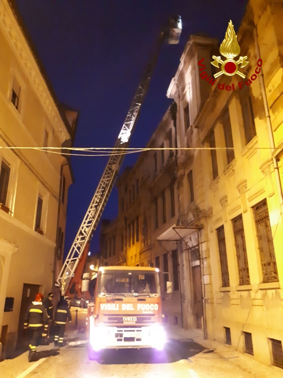 I mezzi di soccorso in via Pompeiana, nel centro storico di Osimo, per il cedimento di una parte del tetto dell’ex Itc Corridoni, palazzo di proprietà della Provincia di Ancona