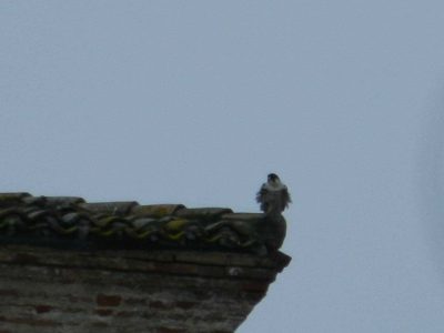 Uno dei falchi pellegrini sulla torre di San Floriano a Jesi (foto associazione Falconieri di Federico II)