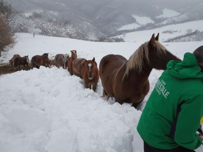 Irraggiungibili e isolati a mille metri di altezza, un branco di quarantacinque cavalli attende di essere messo in salvo dalla Protezione civile sulla cima di Piancerreto, una località presso Montelago, frazione di Sassoferrato in pieno entroterra marchigiano, a un passo dall’Umbria. L’emergenza Burian mette a dura prova tutta la provincia, compresi i suoi allevamenti e i suoi splendidi animali. Lassù in cima, fra settanta centimetri di neve, è da domenica che gli equini sono tagliati fuori da ogni collegamento, da quando con l’arrivo della precipitazione il manto nevoso si è fatto sempre più alto, fino a rendere impraticabile la strada di circa 4 km che collega i pascoli dell’altipiano con Montelago, minuscola comunità di allevatori. Nessuno ha così più potuto portare foraggio ai cavalli che attendono al freddo della montagna da tre giorni,