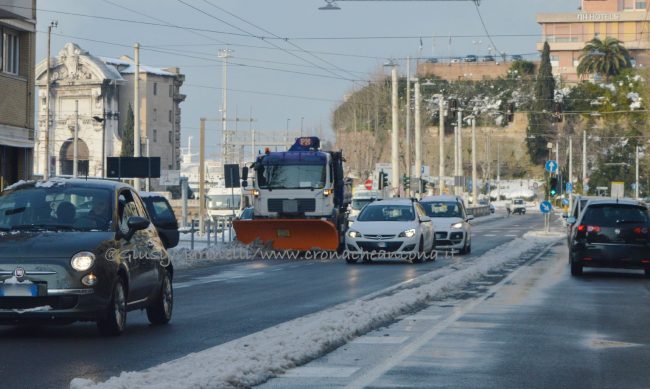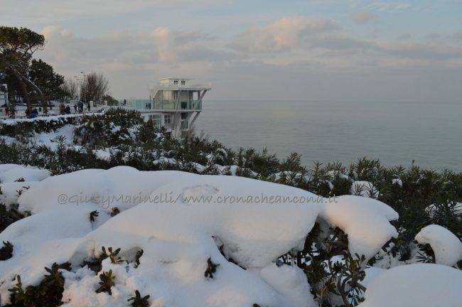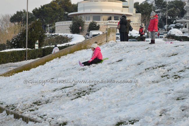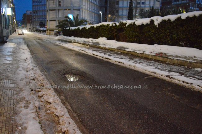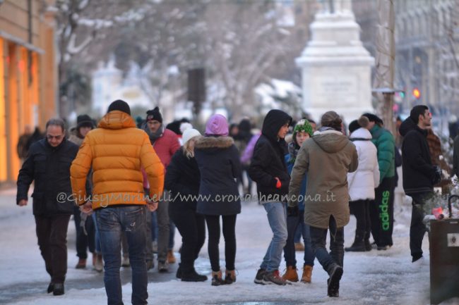 Mezza giornata di tregua, un lento ritorno ai ritmi normali della città che rischia già da questa notte di arrestarsi. Tre giorni praticamente senza sosta di neve sono stati interrotti solo dalle 13 di oggi da qualche raggio di sole, che ha permesso di rifiatare alla macchina dei soccorsi e della protezione civile. Nel tardo pomeriggio circolazione a singhiozzo sull’Asse Nord Sud per permettere ai vigili del fuoco e ai tecnici del Comune di rimuovere le parti di ghiaccio pericolanti negli imbocchi delle gallerie. Durante il giorno è stato liberato anche il porto dai 300 bisonti della strada bloccati nello scalo da domenica sera per il divieto di circolazione sulle strade, scortati fuori città a gruppi di 10 mezzi alla volta dalla polizia municipale. Un lento ritorno alla normalità, si diceva, ma le previsioni meteo mettono di nuovo in allarme: dalle 4 di giovedì mattina e fino alle 14 sono previste nuove nevicate. Un fronte di aria umida e più calda è in arrivo sulla Regione Marche, con il rischio del fenomeno del “gelicidio”, pioggia che gela al contatto con le superfici già ghiacciate dalla bufera di questi giorni.