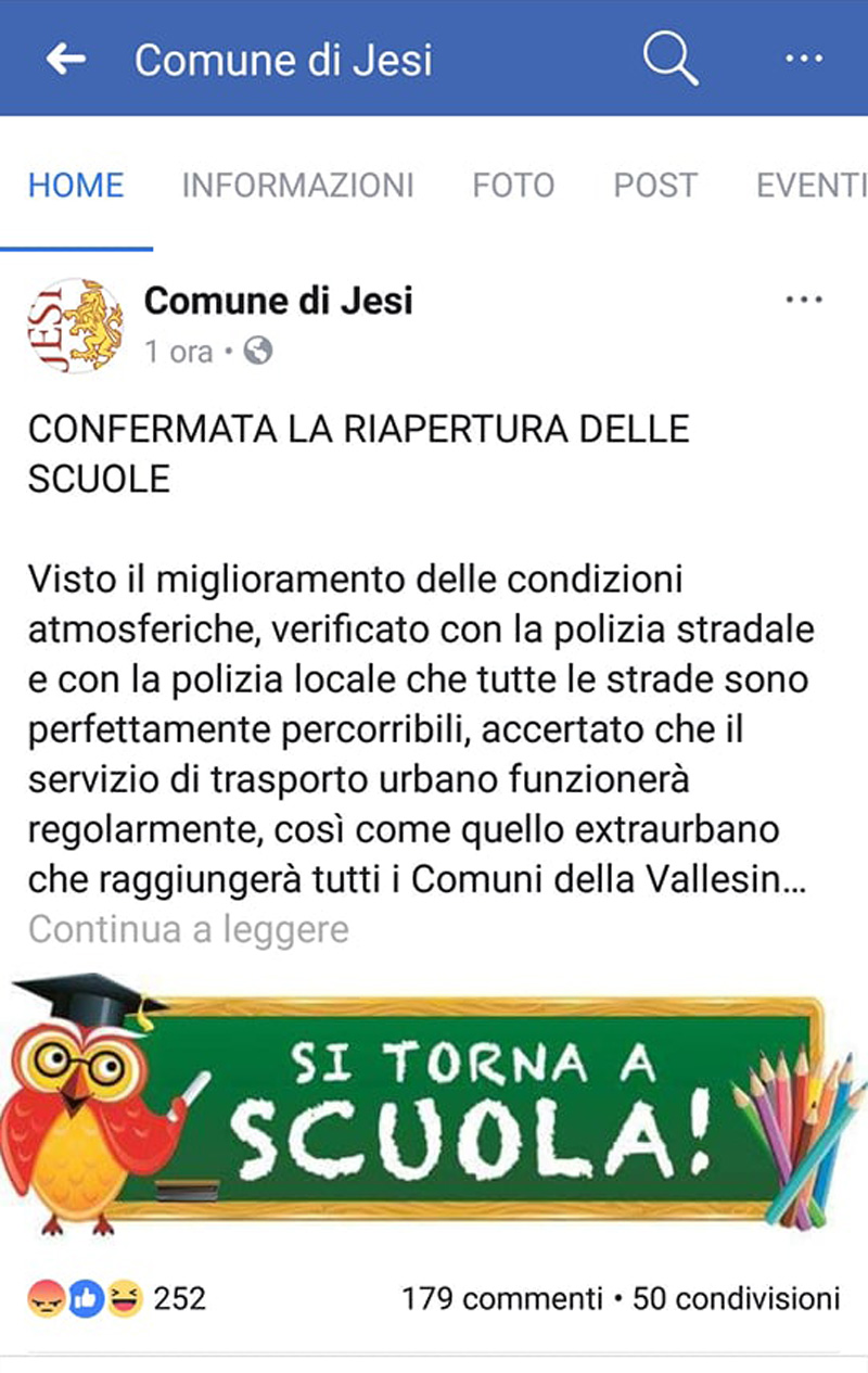 Il Comune di Jesi conferma per domani la riapertura delle scuole e parte la contraerei di commenti farciti di ironia (“Hai infranto uno dei comandamenti più importanti…ci hai deluso massi..#lassalechiuse” o ancora “#massiminocihaideluso”) ma anche insulti, bestemmie e maledizioni contro il sindaco della città dell’imperatore Federico II. Le condizioni metereologiche sono migliorate, come le condizioni della viabilità asseverate dalla polizia stradale, e il servizio di trasporto pubblico urbano ed extraurbano funziona regolarmente. Un’ora fa, sulla pagina istituzionale Fb del Comune è comparsa la comunicazione con la riconfermata della riapertura delle scuole di ogni ordine e grado, asili compresi, a partire da domani, venerdì 2 marzo. “A puro titolo precauzionale – chiariva la nota-  nelle scuole primarie maggiormente numerose, i servizi di controllo davanti agli edifici saranno rafforzati con la presenza di operatori di protezione civile”. Le reazioni di alcuni studenti, soprattutto quelli che abitano in zone periferiche della città ancora colonizzate dalla neve o addirittura in altre città della Vallesina, non si sono fatte attendere. Sono caduti a pioggia centinaia di post sotto quel comunicato stampa. Qualcuno ha esagerato nell’esprimere la propria opinione e qualcun altro ha suggerito di immortalare le parole scritte sopra le righe (alcune prontamente cancellate) tramite screenshot.
