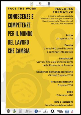 Inizia il 20 aprile e dura tre mesi il primo progetto formativo di FaCe The Work, il bando per le borse-lavoro promosso dai comuni di Cerreto D’Esi e Fabriano. E’ stato ufficializzato oggi in comune, dal sindaco Gabriele Santarelli, il vicesindaco Ioselito Arcioni e Barbara Pagnoncelli, assessore comunale alle attività produttive. Il percorso FaCe The Work nato da Anci Restart, e aperto a 20 partecipanti, residenti nella Provincia di Ancona, dai 16 ai 35 anni, in collaborazione con i Comuni di Fabriano e Cerreto d’Esi, dedica alcuni posti ai residenti di questi due Comuni. Questo progetto è incentrato con gli obiettivi di crescita delle competenze personali, miglioramento delle life skills e delle conoscenze spendibili a livello professionale, le capacità organizzative, gestionali, digitali richieste nel mondo del lavoro attuale e molto “apppropriate” per i giovani. Nel dettaglio molte conoscenze andranno acquisite nei moduli delle lezioni, dal marketing alla grafica pubblicitaria, dal mondo del web alla redazione di video, dalle nozioni di imprenditorialità alla conoscenza dell’evoluzione delle start up innnovative. Questi alcuni gli argomenti al centro delle lezioni che iniziano il 20 aprile, che avranno anche un risvolto pratico con seminari integrativi sui temi dell’imprenditorialità, dell’impresa e del mercato del lavoro e organizzati in collaborazione con il Punto Impresa Digitale della Camera di Commercio di Ancona, incentrati sull’orientamento all’auto- imprenditorialità. Le lezioni si terranno i  giovedì, venerdì e i sabato mattina. I docenti saranno quelli dell’Università di Urbino Carlo Bo, che  valorizzeranno sia le competenze distintive sia le esperienze e professionalità maturate dai giovani.  Le domande scadono il 5 aprile e vanno inviate a facethework@uniurb.it entro le 12.00 del medesimo giorno. Le prove di selezione, qualora le domande fossero di più dei posti disponibili, avverranno il 9 aprile.