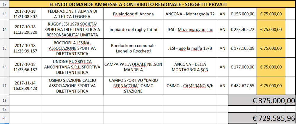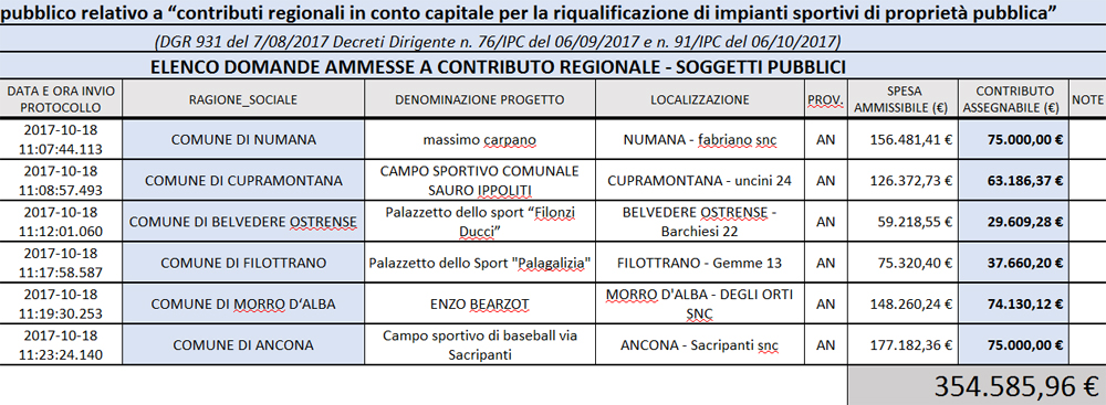 Sono undici gli interventi di riqualificazione degli impianti sportivi pubblici finanziati con i fondi della Regione Marche nella provincia di Ancona. La somma destinata è di 729 mila euro, quota parte dei 3,7 milioni ripartirti, a livello regionale, tra i 64 progetti ammessi sui 133 pervenuti. La dotazione iniziale del bando, pari a 2,4 milioni, era stata incrementata con ulteriori 1,3 milioni del Bilancio 2018/2020. Prevedeva fino al 50 per cento a fondo perduto, con un tetto massimo di 75 mila euro per intervento. Nell’Anconetano sei sono promossi da soggetti pubblici, cinque da privati. “Risorse importanti per riqualificare le strutture sportive di base e promuovere lo sport in tutte le fasce d’età – commenta l’assessora Manuela Bora – Sono investimenti molto attesi dal territorio, sostenuti, dopo un decennio, con risorse regionali, a dimostrazione di come il governo regionale assegni una priorità alla diffusione e all’implementazione della pratica sportiva tra la popolazione. Oltre all’aspetto agonistico e ludico, lo sport è un’eccezionale strumento di prevenzione e di tutela della salute che promuoviamo con determinazione”. I Comuni e le società sportive ammesse a contributo dovranno presentare entro 30 giorni la dichiarazione di accettazione del finanziamento e un cronoprogramma dei lavori. Entro 12 mesi dalla comunicazione dovranno iniziare i lavori e terminare entro 24 dalla data di comunicazione del finanziamento. Nella provincia di Ancona ai sei interventi proposti dai soggetti pubblici vanno 354 mila euro di contributi. Gli enti interessati sono i Comuni di Numana, Cupramontana, Belvedere Ostrense, Filottrano, Morro D’Alba e Ancona. I cinque proposti dai soggetti privati, ai quali vanno 375 mila euro, sono pervenuti dalla Federazione italiana atletica leggera (Palaindoor di Ancona), da Rugby Jesi 1970 (impianto Latini di Mazzangrugno), Bocciofila Jesina (bocciodromo comunale Leonello Rocchetti), Unione Rugbistica Anconetana (campo palla ovale Nelson Mandela della Montagnola), Osimo Stazione Calcio (campo sportivo Dario Bernacchia Osimo Stazione).