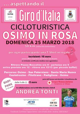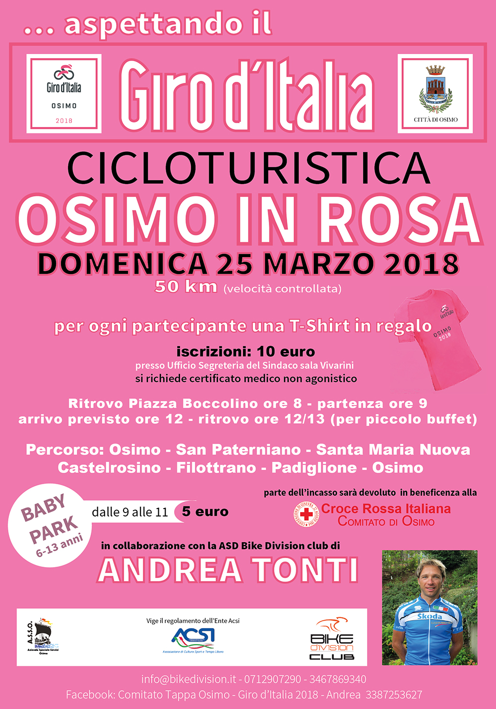 La cicloturistica da 50 chilometri ‘Osimo in rosa’, è in programma per domenica, 25 marzo. Sarà un altro appuntamento da non perdere, organizzato nell’ambito degli eventi a corredo dell’11° tappa Assisi-Osimo del Giro d’Italia, dal Comune di Osimo in collaborazione con la Asd Bike Division Club e la Asso. Vi parteciperà anche Andrea Tonti, ex ciclista professionista più volte protagonista al Giro d’Italia, alla Vuelta e ai Campionati del Mondo al fianco di campioni del calibro di Mario Cipollini, Paolo Bettini, Alessandro Ballan, Gilberto Simoni e Damiano Cunego. Il ritrovo per i partecipanti è previsto per le ore 8 in Piazza Boccolino, con partenza alle ore 9. T-shirt in regalo per ogni partecipante. Ai corridori sarà richiesto un certificato medico non agonistico. Le iscrizioni costano 10 euro adulti – 5 euro bambini (baby park) da versare presso la segreteria del sindaco di Osimo (Sala Vivarini). Parte del ricavato sarà devoluto in beneficenza alla Croce Rossa Italiana – Comitato di Osimo. (info: segreteria del sindaco 071 7249221 – 3387253627; info@bikedivision.it 0712907290 – 3467869340)