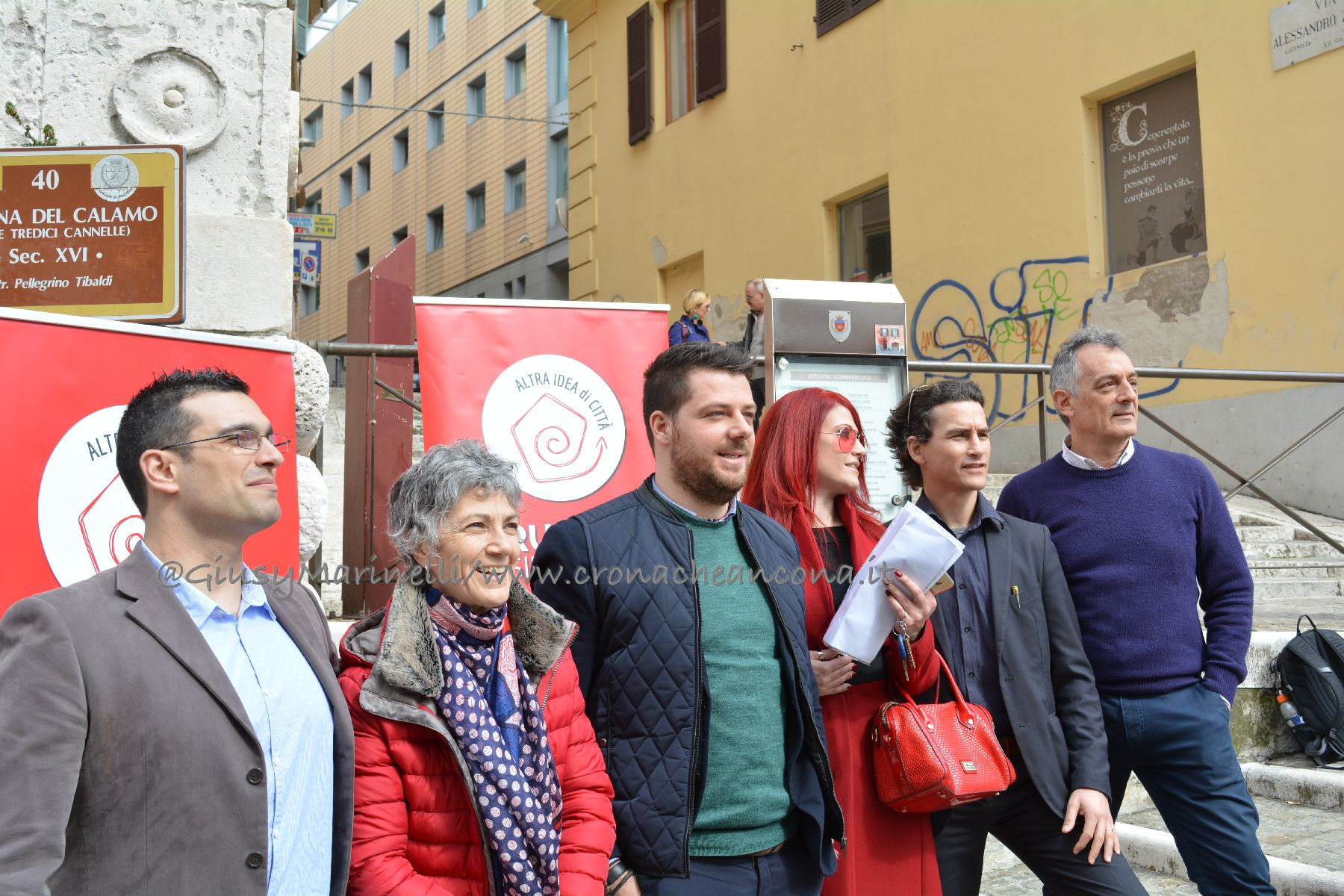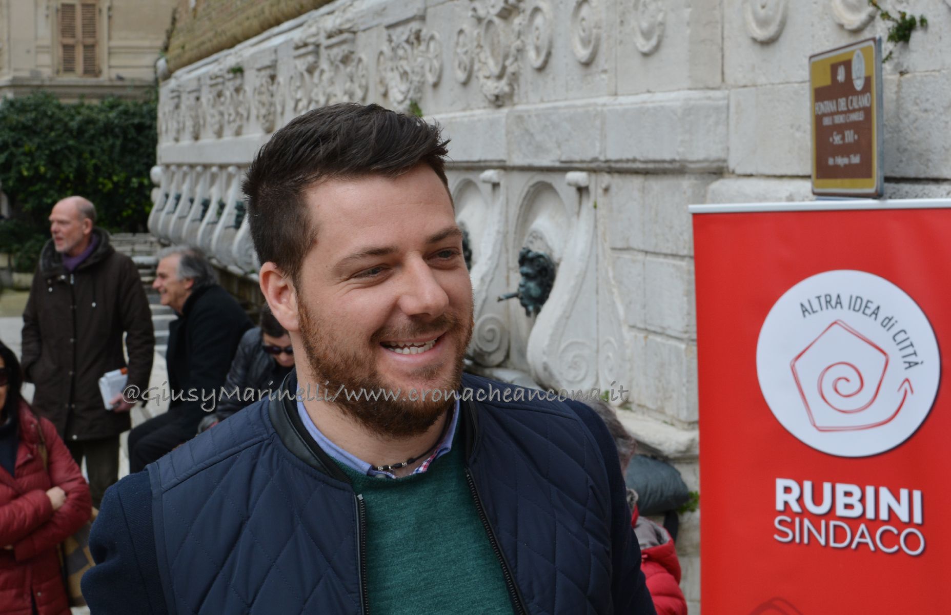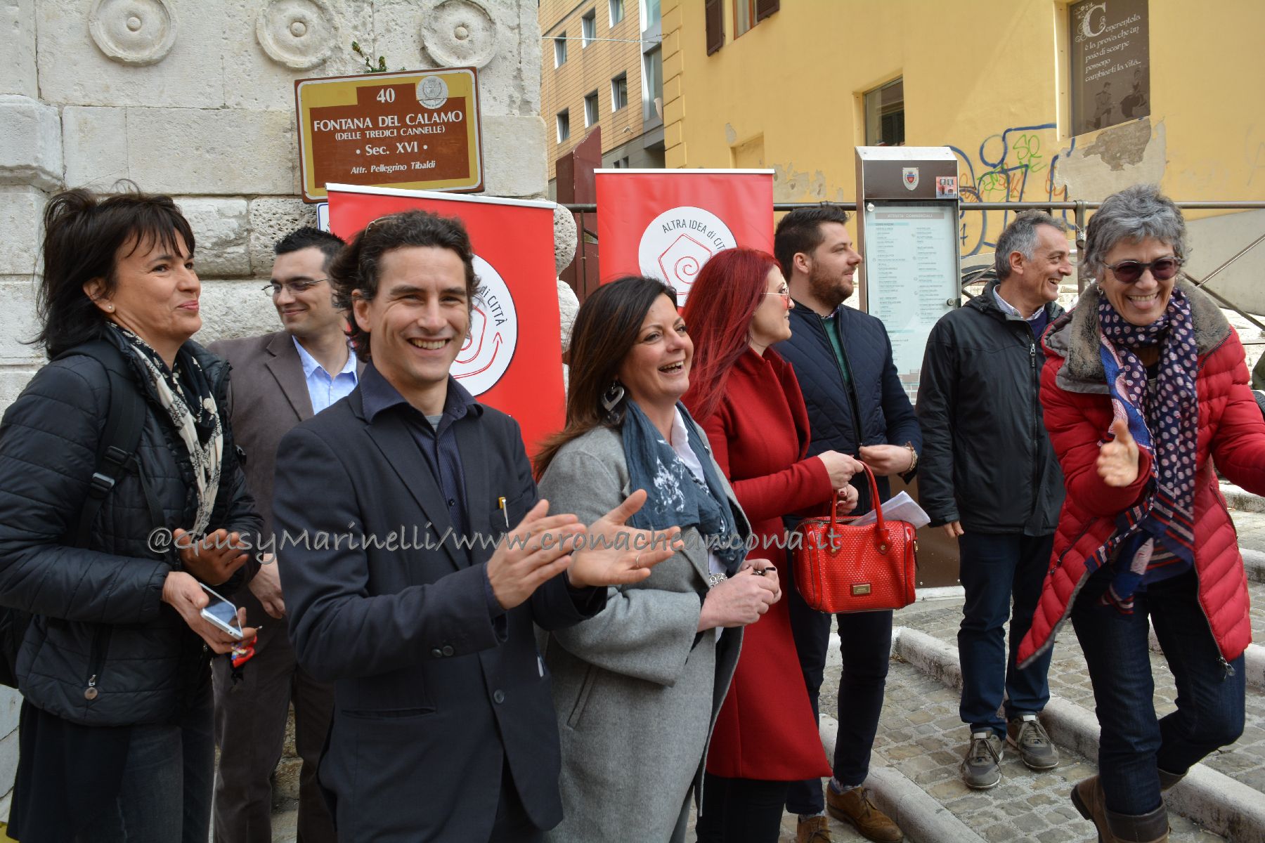 Conferenza stampa en plein air per il candidato sindaco della lista civica Altra idea di città Ancona, Francesco Rubini, di fronte alla Fontana del Calamo, ai piedi del luogo «simbolo della cattiva amministrazione targata Mancinelli, che non ha governato la città, ma l’ha gestita come se fosse a capo di un cda di un’azienda di provincia, con il solo obiettivo del pareggio di bilancio», inizia Rubini. Anconetano, 27 anni, consigliere comunale uscente per Sel-Abc e avvocato praticante, è lui il portabandiera della squadra di Altra Idea di Città, la nuova lista civica che si affaccia alle prossime elezioni. Il luogo simbolo scelto per il debutto è il numero 1 di via Zappata, sede dell’istituto musicale pareggiato Pergolesi, chiuso nel 2015, dopo che Comune e Provincia, hanno interrotto il finanziamento alla scuola di musica. «Un’eccellenza musicale − prosegue Rubini − chiusa senza motivazione, fatta propria da altre realtà locali e che ha costretto centinaia di ragazzi a formarsi altrove. Ma altri sono i luoghi che questa amministrazione, in maniera colpevole e miope ha chiuso, pensiamo ad esempio alla stazione marittima. L’ultimo treno, che non creava traffico, inquinamento, malattie, è stato fatto passare nel 2015 e da quel giorno la stazione marittima marcisce. Ma l’elenco del patrimonio pubblico in abbandono o messo in vendita ai privati è lungo, dal caso degli ex Mutilatini al vecchio faro o il pericolo della costruzione di un hotel al Parco del Cardeto. Queste sono le politiche sbagliate che vogliamo ribaltare − afferma Rubini − riportando al centro del dibattito le persone ed i beni comuni che in questi cinque anni sono stati derubricati. Altra idea di città vuole governare la città e non fare ordinaria amministrazione, qual è chiudere le buche o liberare le strade dalla neve, il minimo indispensabile per una città per dirsi civile».