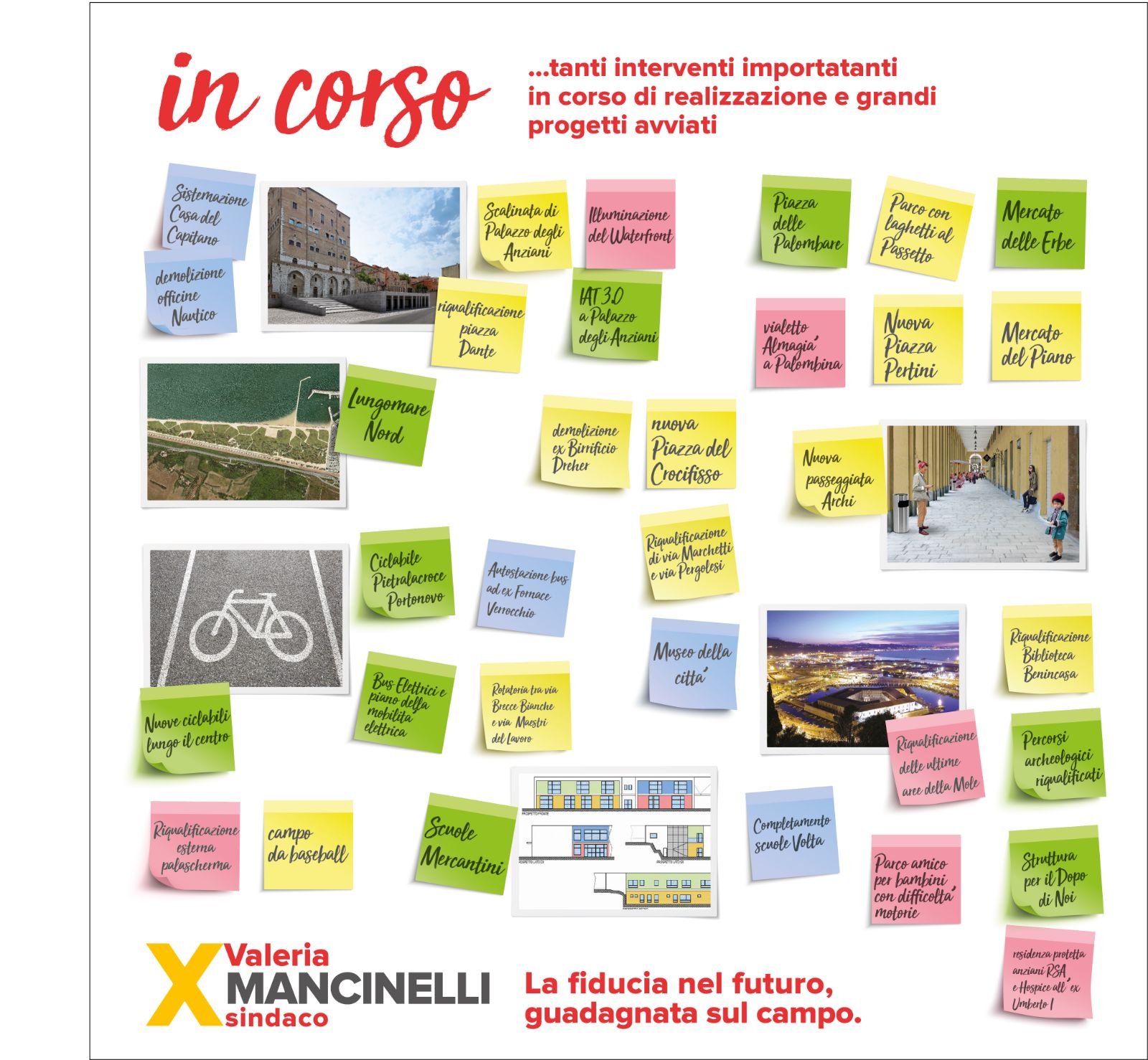 A fare mostra di sé dalle vetrine della sede un grande pannello che riproduce con ideali polaroid gli interventi scelti dal Comitato come i più sgnificativi degli ultimi cinque anni: dall’ascensore del Passetto alle grandi mostre, da piazza Cavour al porto antico, dalle asfaltature delle strade su larga scala agli eventi come il Natale, dalle grandi mostre fotografiche alla riapertura della Pinacoteca, alla riqualificazione delle scuole, agli impianti sportivi rinnovati ed i tanti progetti nel sociale. Accanto, post-it e rendering per i tanti progetti in corso di realizzazione, quelli finanziati, quelli in corso di progettazione e alcuni in fase di appalto e realizzazione: le scuole Mercantini; la demolizione delle officine del Nautico, il Mercato delle Erbe, il completamento del quartiere Palombare.