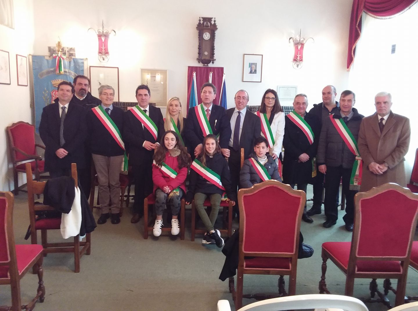 La foto ricordo dei sindaci della Vallesina nel quarantennale della strage di via Fani, scattata nell’aula consiliare di San Paolo di Jesi e postata sui social media dalla prima cittadina di Staffolo, Patrizia Rosini