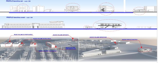 LA NUOVA SEDE DEI CIRCOLI NAUTICI A OVEST. Il restyling dell’area est del porto turistico porterà alcuni cambiamenti anche all’area ovest, quella dove sorge il Triangolone. L’ampliamento delle scuole vela ad est renderà necessaria la costruzione di un nuovo volume, ad ovest, nella banchina del piazzale adiacente al rimessaggio a mare, che sarà la nuova sede dei circoli nautici, con uffici, deposito di attrezzature, aule didattiche. La nuova struttura è prevista di due piani.