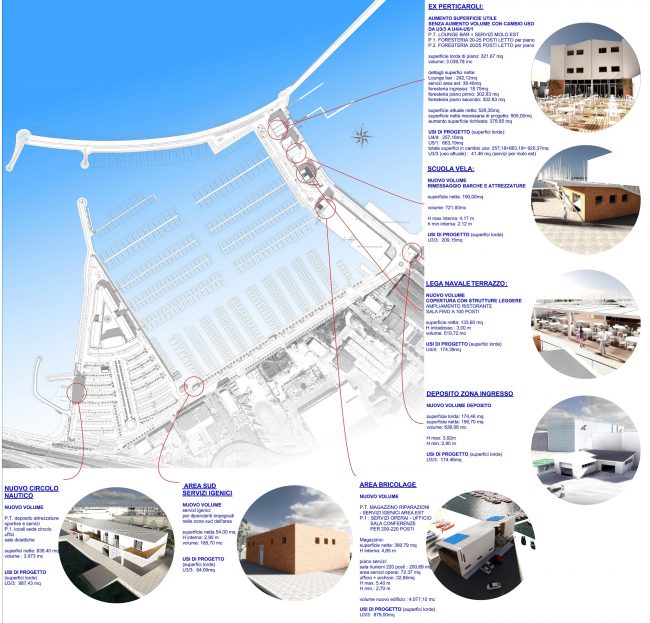 IL NUOVO RISTORANTE CON TERRAZZA. Dunque, qual è la trasformazione dell’area est previste dal progetto dell’architetto Carlo Beer? Innanzitutto la riqualificazione e trasformazione dell’edificio industriale ex Gmg Perticaroli, adiacente al capannone Vitali, oggi utilizzato come deposito, in una struttura ricettiva a servizio dei diportisti e delle squadre ospiti di regate ed eventi, con il riutilizzo dei volumi esistenti (oltre 3 mila metri cubi), nonché un ampliamento della superficie esistente per circa 380 metri quadrati. L’idea è realizzare due piani, con al piano terra un bar/lounge-bar con servizio di ristorazione al tavolo ed un primo piano di foresteria che si estenderà anche al secondo piano con camere da 4/5 posti letto per un totale di circa 50 posti letto (20/25 per piano). Tutto corredato, naturalmente, da servizi igienici adeguati. Una trasformazione per la quale è richiesta una variante. Il ristorante che dovrà sorgere potrà contare di una terrazza, in parte coperta, da 90/100 posti a sedere, ricavata da quella dell’edificio che oggi ospita la Lega Navale, attualmente libera. Il progetto prevede di realizzare un ampliamento e sopraelevazione con strutture leggere prefabbricate, removibili e con pareti vetrate verso est e verso ovest. La nuova volumetria non occuperà tutto il piano ma lascerà la possibilità di utilizzare parte del terrazzo completamente scoperto.