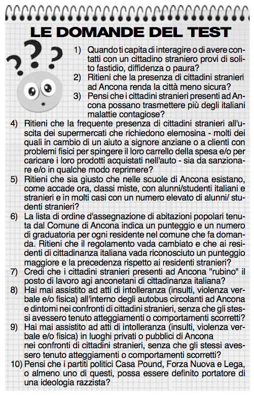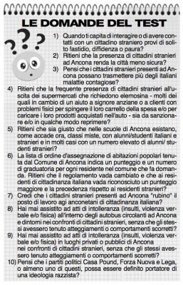 “particolarmente “divisivo, visto che è così sentito il problema della ricerca di un alloggio a prezzi contenuti”: per 42 soggetti sottoposti al test, il regolamento della lista di assegnazione di abitazioni popolari del Comune va cambiato; ai residenti italiani vanno riconosciuti un punteggio maggiore e la precedenza rispetto ai residenti stranieri. “Siamo di fronte ad una immotivata pulsione discriminatoria – hanno aggiunto Irene Coltrinari e Alessia Pasqualini – poiché gli stranieri inseriti in graduatoria hanno il permesso di soggiorno e sono in regola per presentare la domanda, accompagnata da certificazione relative a parametri come l’Isee (Indicatori di situazione economica equivalente), i redditi familiari molto bassi, il numero elevato di figli a carico. “Alcuni, a margine della scheda-test, hanno appuntato o evidenziato verbalmente che ad una persona “anconetana” andrebbe riconosciuta una precedenza per la casa concessa da Erap (Ente regionale per l’abitazione pubblica nelle Marche)/Comune proprio perché nata in città o da molti più anni di uno straniero residente in città”, hanno detto ancora Cotrinari e Pasqualini.