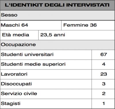 Puntualizzati questi punti di vista su certi “si dice”, ecco tuttavia le contraddizioni, l’altra faccia dello specchio percettivo. Intolleranza, appunto, pulsioni di rigetto per chi è arrivato da oltre confine nella Dorica, per i 35 giovani che ritengono che sia da sanzionare e/o in qualche modo da reprimere la frequente presenza, in questo caso soprattutto di nordafricani o africani in genere che chiedono l’elemosina piazzandosi all’uscita dei supermercati. Un fenomeno da contrastare, attenzione, anche se gli stessi ricevono qualche spicciolo in cambio di un aiuto a signore anziane o a clienti con problemi fisici per spingere il loro carrello della spesa e/o per caricare in auto i prodotti acquistati (come recita il quesito 4). Tra i 65 che la pensano in modo diverso, una studentessa universitaria, che annota a margine del questionario che “per evitare che si riducano ad elemosinare, bisognerebbe aiutarli a trovare un lavoro dignitoso”.