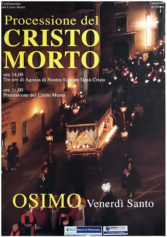 Sarà una Pasqua accogliente e ricca di proposte quella che si appresta a vivere Osimo nel ponte festivo. Tre giorni di cultura e folklore nella città dei senza testa, che partiranno venerdì sera con la tradizionale e suggestiva processione del Cristo Morto. La via crucis con i 300 sacconi onora una tradizione che si perpetua dal 1700. Il Venerdì Santo osimano inizierà alle 14 nella Cattedrale di San Leopardo con le “Tre ore di agonia di Gesu’ Cristo”. Alle 18 inizierà la vestizione dei sacconi, i penitenti incappucciati, da piazza Duomo sfileranno per il centro storico della città dopo le 20.