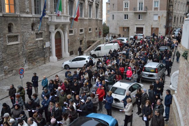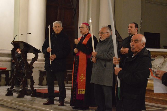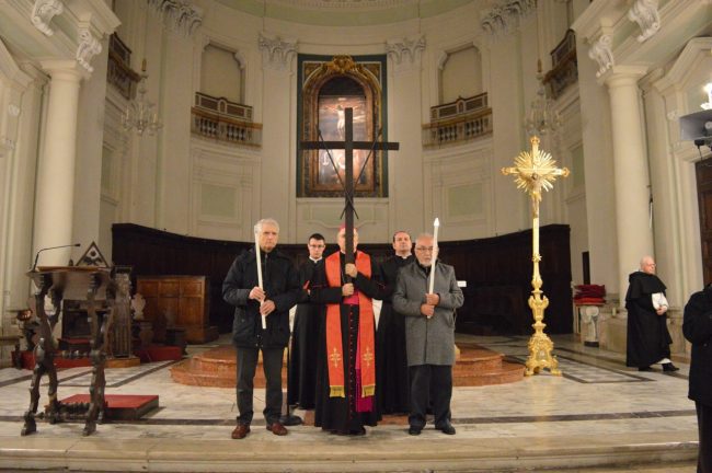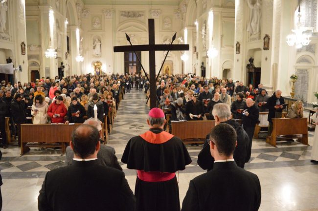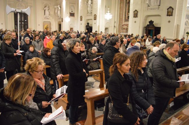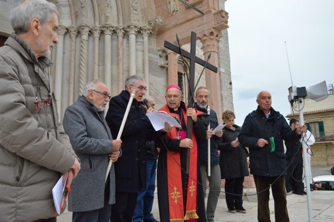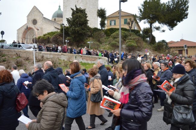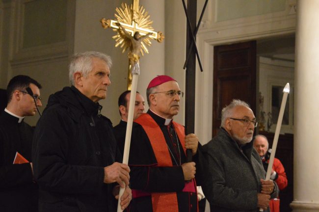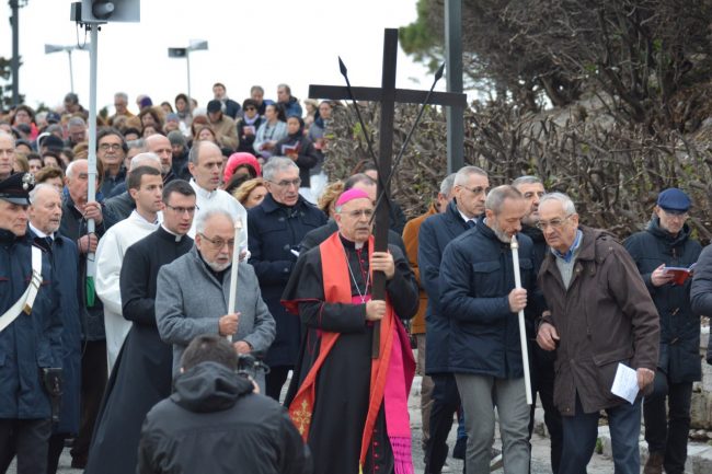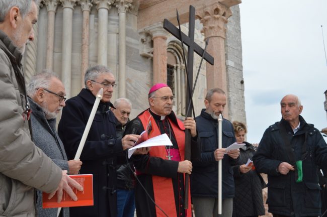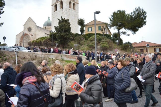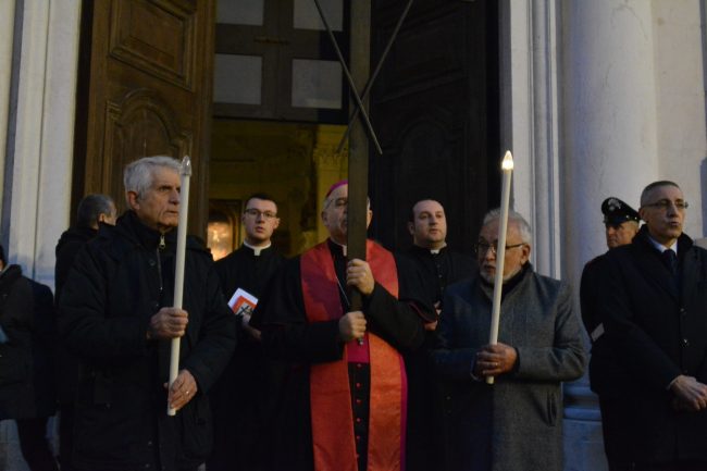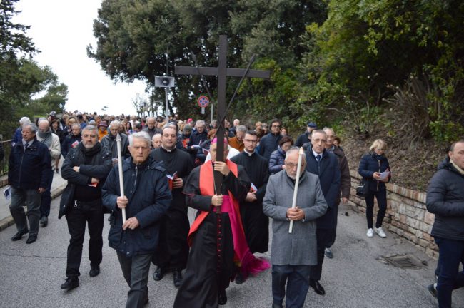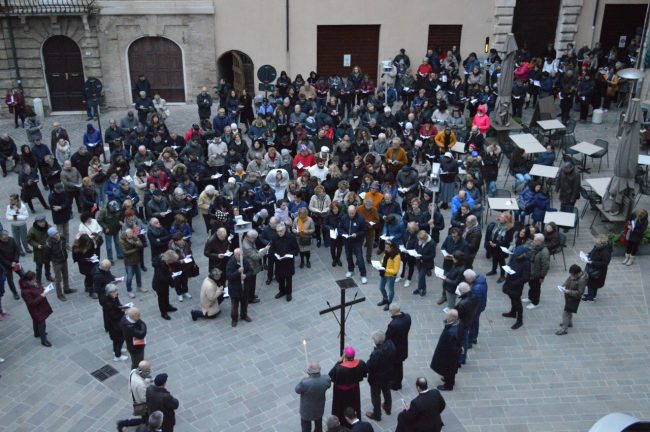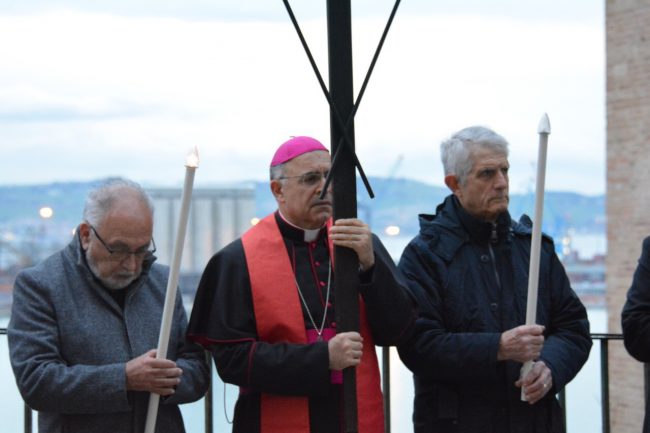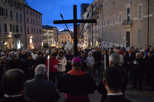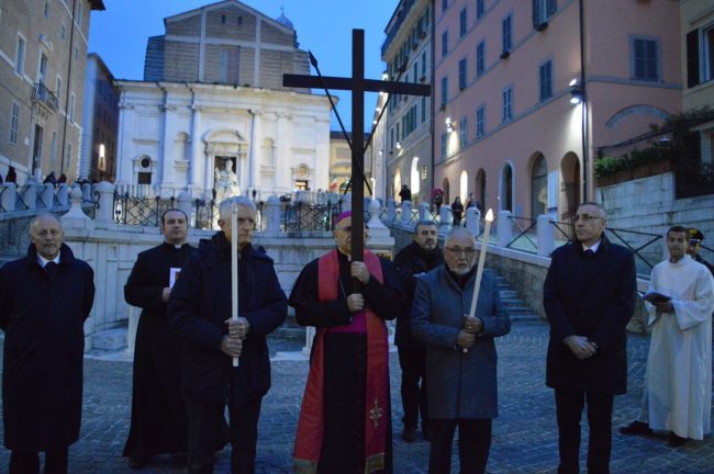 Un serpentone di persone raccolte in preghiera, dalla cattedrale di San Ciriaco fino alla chiesa di San Domenico. Si è conclusa poco fa la via Crucis del venerdì santo. La prima presidiata dal monsignor Angelo Spina come arcivescovo di Ancona. In centinaia si sono raccolti dopo le 18 nel piazzale antistante la cattedrale. Alle 18.45 la partenza della processione, terminata in piazza del Papa con l’ingresso dei credenti nella chiesa di San Domenico. Proprio qui, l’arcivescovo ha tenuto la celebrazione del venerdì santo, aspettando la Pasqua.