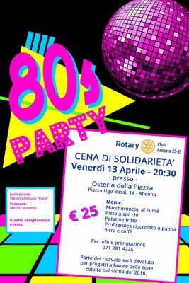 Una cena in stile anni Ottanta per raccogliere fondi da destinare alle zone colpite dal sisma. È questa l’iniziativa promossa dal Rotary Club Ancona 25-35 per aiutare le popolazioni marchigiane a rialzarsi dopo la tragedia del terremoto. L’evento si terrà venerdì all’Osteria della Piazza, al Piano.  “A distanza di due anni dal sisma – fa sapere il Rotary – la cena dedicata al ricordo dei mitici anni ’80 è un’occasione per non dimenticare le popolazioni che, a seguito dei disastrosi eventi del 2016, si trovano ancora in condizioni di vita disagiate. Dieci euro, su 25 complessivi del costo della cena, saranno destinati, infatti, al progetto Fenice del Distretto 2090, che prevede una serie di azioni mirate a sostenere la rinascita sociale, culturale ed economica dei