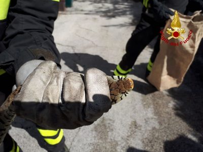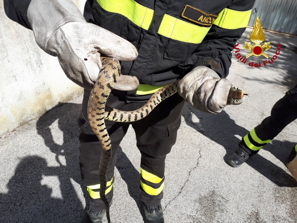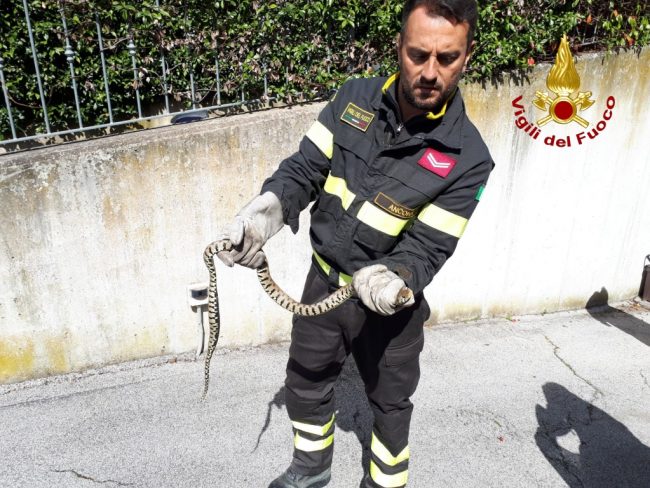 “Aiuto, c’è un serpente in giardino”. Stamattina verso le 11.30, un rettile lungo un metro e mezzo è spuntato all’improvviso davanti al garage di un’abitazione di San Sabino di Osimo. I proprietari dell’immobile l’hanno visto strisciare sulla pavimentazione esterna del giardino con le squame colorate come quelle di un pitone e agitati hanno subito telefonato ai vigili del fuoco di Osimo. Con prontezza di riflessi il padrone di casa, grazie a uno scopettone è riuscito anche a bloccare l’animale ma non essendo in grado di decodificare il grado di pericolosità ha chiesto alla squadra di pompieri dalla vicina caserma di arrivare il prima possibile sul posto. I vigili del fuoco dopo aver catturato e immobilizzato il rettile, hanno chiesto una consulenza ai carabinieri Forestali che hanno tranquillizzato tutti. Si trattava di biscia, innocua, non pericolosa per l’uomo, che è stata pertanto liberata in aperta campagna.