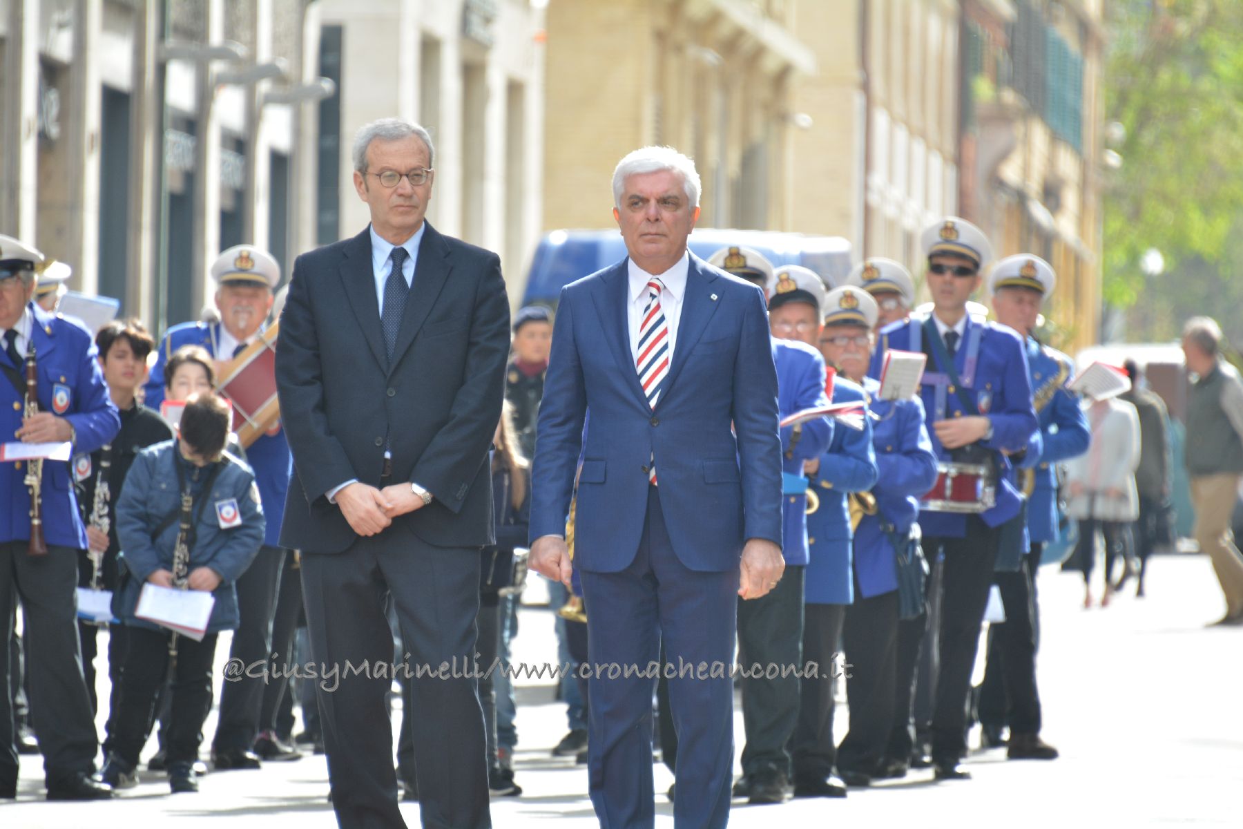 A sinistra il prefetto Antonio D’Acunto, a destra il questore Oreste Capocasa, alla testa del corteo lungo corso Garibaldi che ha aperto la cerimonia