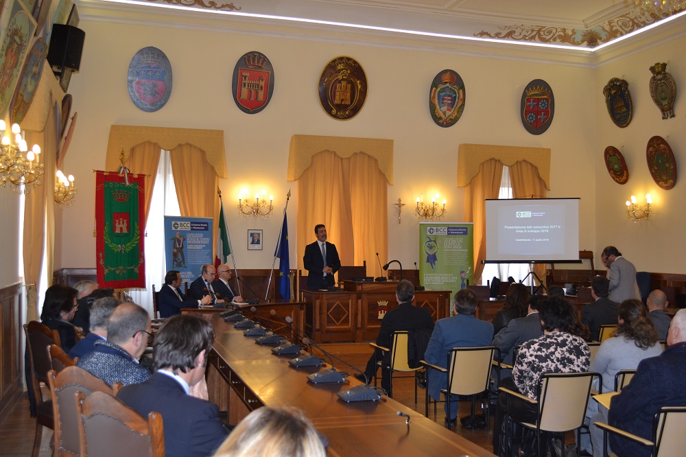 La Banca di Credito cooperativo di Civitanova e Montecosaro “sbarca” nell’Anconetano con tre nuove sedi, senza nascondere l’ambizione di diventare la banca dei marchigiani. Presentato stamane nella sala consiliare del Comune di Castelfidardo il progetto di ampliamento territoriale della Bcc di Civitanova. Tra fine maggio e primi di giugno saranno pienamente operativi tre nuove filiali: la sede distaccata a Castelfidardo, in via Lorenzo Pelosi 9, e le due filiali a Loreto, in via Donato Bramante 41, e Osimo, in via Vittorio Bachelet 13 in zona Campocavallo. Con queste nuove bandiere piantate sul territorio, la Bcc di Civitanova diventa l’istituto di credito cooperativo più grande per copertura territoriale delle Marche, con 16 sedi e tre province coperte (Ancona, Macerata e Fermo). Passo avanti per il progetto di medio periodo che vede la Bcc di Civitanova e Montecosaro pronta a diventare di livello regionale, all’interno del gruppo Cassa Centrale Banca, a cui ha aderito. “E’ un momento storico – commenta il presidente della Bcc di Civitanova e Montecosaro Sandro Palombini -. L’autorizzazione ottenuta da Bankitalia per le nuove sedi non è affatto scontata ed è in controtendenza, in un periodo in cui si parla solo di riduzioni di filiali. Un risultato che ci rende più coerenti e pronti all’obiettivo dello sviluppo della banca. I numeri ci dicono che siamo solidi dal punto di vista patrimoniale, ma abbiamo l’esigenza di crescere gli impegni e l’aggregato patrimoniale. Conosciamo il territorio, sappiamo che è fatto di validi imprenditori, su cui puntiamo”. Il direttore generale Marco Moreschi ha riassunto le performance della banca. Segni positivi su tutti i principali aggregati patrimoniali: + 3.2% la raccolta complessiva a 653 milioni con particolare enfasi per l’indiretta a +18%; anche gli impieghi segnano una crescita importante e in controtendenza pari ad un + 5,7% a 314 milioni di euro. Da segnalare l’intervento straordinario di copertura del credito ammalorato, che pesa per il 13,4% del totale impieghi, ha portato il livello di copertura al 53% ed ulteriormente migliorato il texas ratio portandolo al 47,3%.