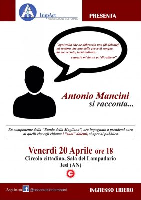 ImpAct Associazione Culturale, organizzazione di giovani studenti ed universitari di Jesi e della Vallesina, invita la cittadinanza a partecipare al secondo evento del 2018 dal titolo “Antonio Mancini si racconta”, che si terrà venerdì 20 aprile alle ore 18 presso la Sala del Lampadario del Circolo Cittadino di Jesi.