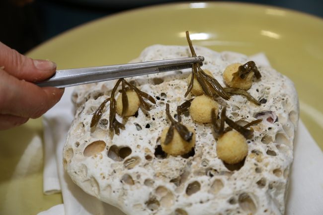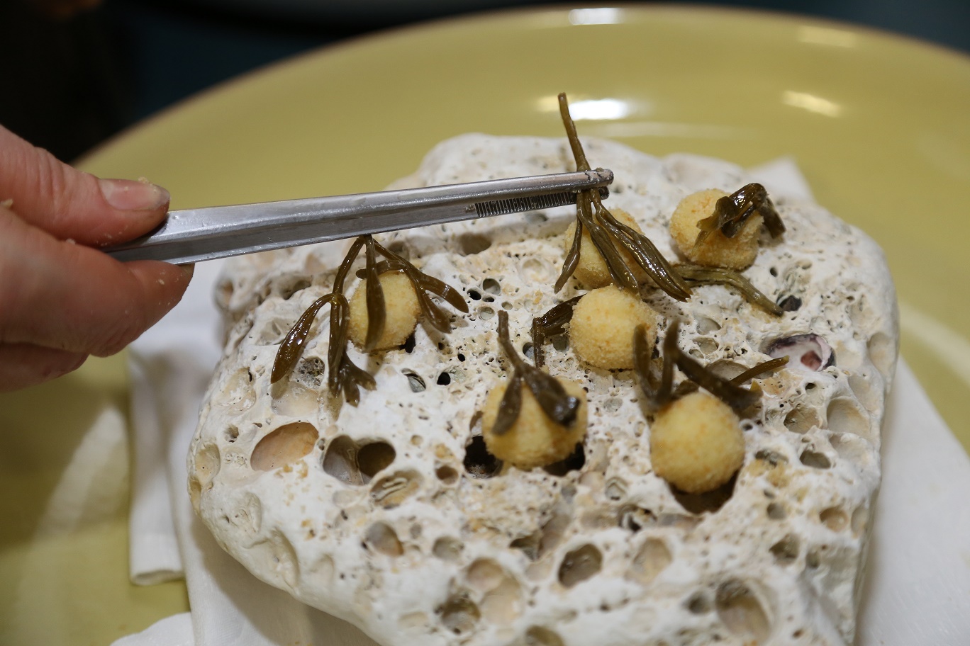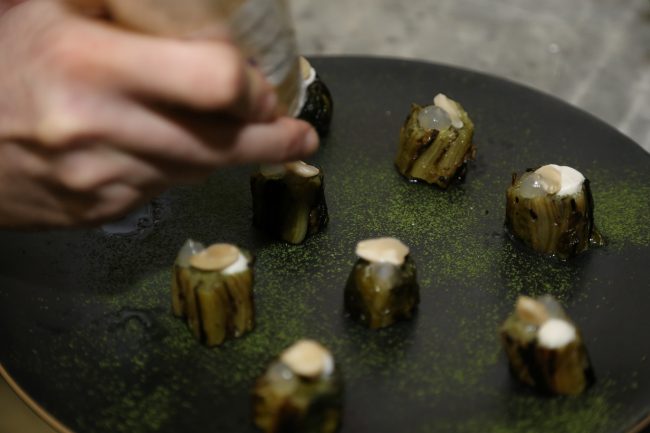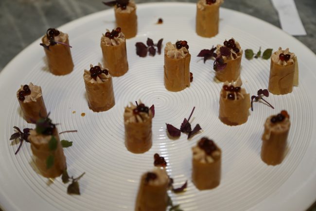 Ci sono il mare e la campagna delle Marche nei finger food proposti da Errico Recanati, accompagnati da un calice del Verdicchio dei Castelli di Jesi Doc Spumante brut 2015 di Fazi Battaglia. Si parte con il profumo di camino di “Lattuga alla brace, mistrà e mandorla”, una citazione dagli anni ’60 sfumata in mare con i “Pacca-Sassi”, “finocchio marino” cresciuto tra gli scogli del Conero, citato anche da Shakespeare nel suo “Re Lear”. L’opulenza del gusto degli anni ‘80 si concentra nel cannolo croccante, un vol au vent reinterpretato per accarezzare il palato.