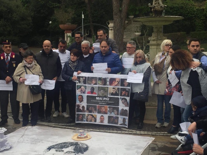 Il flash mob nella Villa comunale di Chieti per Dino, Marina e le altre vittime di Rigopiano (foto Ansa)
