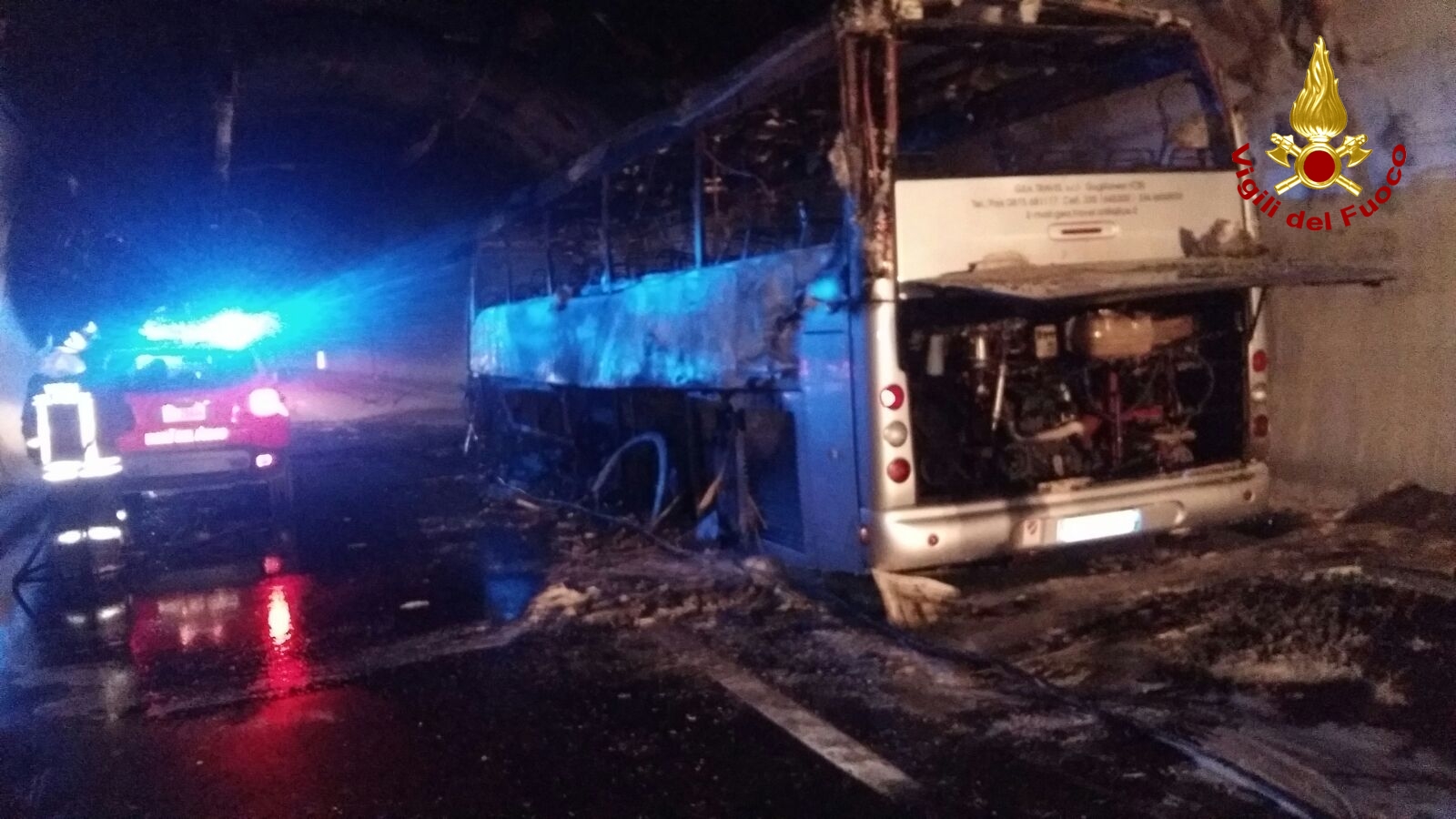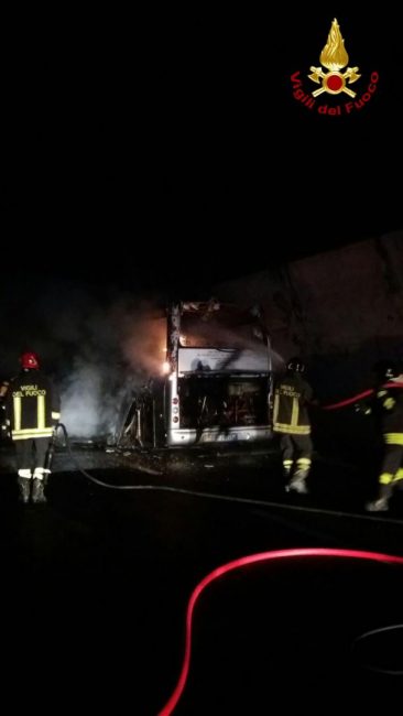 Il bus degli studenti dell’Ipsia di Senigallia che si è incendiato stamattina sotto una galleria del’A1, a Savona
