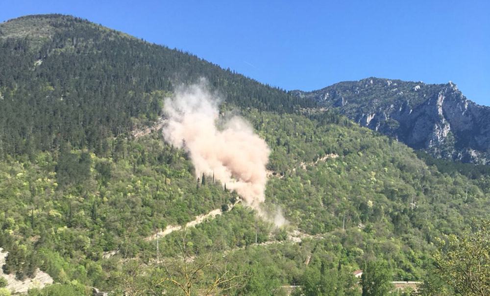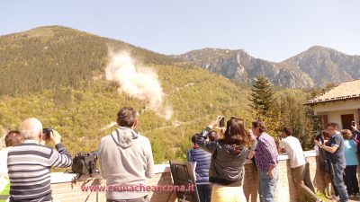 E’ stato fatto esplodere stamattina lo sperone di roccia in località Pontechiaradovo di Genga che incombeva sull’abitato di Palombare. In particolare a saltare è stata la parte aggettante la ferrovia, segnata da una fessura molto evidente nella roccia rossa. Una detonazione azionata con un quarto d’ora di ritardo rispetto all’orario previsto per stamattina alle 10. Per questioni di pubblica sicurezza, i carabinieri di Genga hanno supervisionato le operazioni di innesco degli artificieri, con vigili del fuoco, sanitari del 118 e Protezione civile in allerta. L’amministrazione comunale di Genga ha cercato di tagliare i tempi per neutralizzare il potenziale pericolo racchiuso a suo giudizio, nel masso, in una zona sismica. L’area è stata transennata e le abitazioni dei residenti più a ridosso sono state fatte sgomberare, anche la famiglia che per protesta avrebbe voluto barricarsi in casa. A debita distanza, un pubblico di curiosi ha assistito alle operazioni. Tra loro giornalisti, curiosi e abitanti di Falcioni, Pontechiaradovo e Palombare, tra cui alcune persone che hanno sgomberato stamattina.