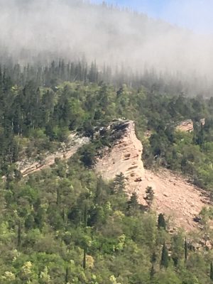 Il balzo di roccia stamattina prima di essere parzialmente demolito. Si nota l’imbracatura di sicurezza che si è letteralmente aperta in due durante l’esplosione