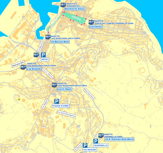 La viabilità. Confermato il servizio gratuito di bus navetta, attenzione ai divieti di circolazione e sosta che scatteranno dalle 20 di lunedì 30 aprile fino alle 6 di sabato 5 maggio, la zona più critica sarà il Guasco. Traffico interdetto in piazza Cavour (lato portici), corso Garibaldi, corso Stamira, piazza Pertini, piazza Stamira, piazza Roma, via XXIX Settembre, piazza della Repubblica, piazza Kennedy, via dell’Appannaggio, largo Sacramento, via Astagno (tra corso Garibaldi e corso Stamira), via del Traffico, via Podesti (tra corso Garibaldi e corso Stamira), via Don Gioia, via Leopardi (tra via Palestro e corso Garibaldi), via Villafranca, via Marsala (da via Palestro a corso Mazzini), via Menicucci e via Castelfidardo. Via Pizzecolli e via Matas invertono il loro senso di marcia: da piazza Stracca direzione obbligata verso via Fanti. In pratica l’unica uscita dal quartiere Guasco per le automobili sarà in direzione via Oddo di Biagio-via Matteotti verso via Vecchini. Come negli anni passati sarà attivata la navetta collega il parcheggio dello Stadio del Conero con il centro. Questo servizio funziona dal 1 al 4 maggio, dalle ore 14.42 alle ore 22, con una corsa ogni 10 minuti. Le partenze dal parcheggio iniziano alle ore 14.42 per terminare alle ore 21.12. Le partenze da via Vecchini iniziano alle 15 e continuano, con una corsa ogni 10 minuti sino alle 21.30, con due corse aggiuntive alle 21.45 e 22.00. Ogni giorno sono previste 83 corse giornaliere. Il tempo di percorrenza è di circa 17 minuti. Questo servizio, gratuito al pubblico, è organizzato da Conerobus e finanziato dalla Fiera. La novità di quest’anno, organizzata da Comune con Conerobus, è l’istituzione di una navetta dalla stazione ferroviaria, con sosta al parcheggio degli Archi, percorso interno al porto e fermata all’ex stazione marittima della banchina Da Chio. Tutti aperti a pagamento con orario prolungato i parcheggi Stamira, degli Archi, Cialdini e Umberto I. Resterà chiuso invece il parcheggio Traiano.