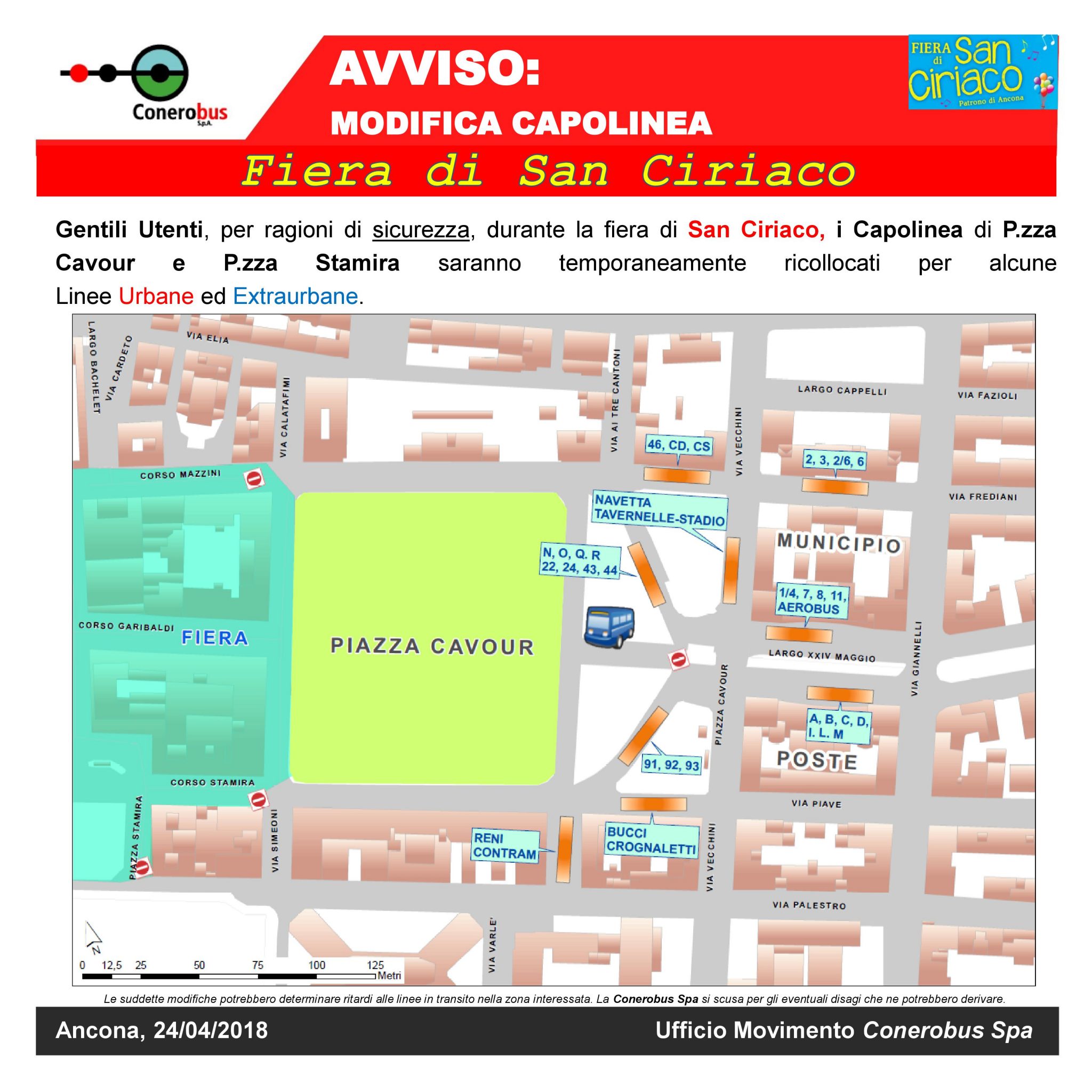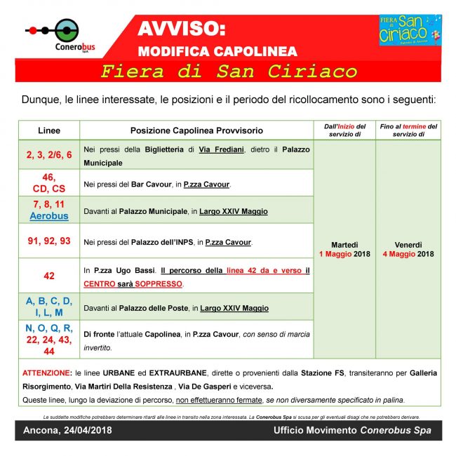 Fiera di San Ciriaco, ecco come cambiano capolinea dei bus e le regole del carico e scarico per consentire al meglio la festa di quattro giorni del patrono. I capolinea di Piazza Cavour e piazza Stamira saranno ricollocati temporaneamente in altro punto per il periodo della Fiera. In particolare, le linee A, B,C, D, I, L, M, avranno il loro capolinea davanti al Palazzo delle Poste. Inoltre le linee 7,8, 11, areobus avranno la fermata davanti al Municipio – largo XXIV Maggio – alla palina dell’1/4 che mantiene la sua regolare fermata. Linee 2,3, 2/6, 6 avranno capolinea nei pressi della biglietteria di via Frediani, dietro al Municipio. Le linee 46, CD, CS, nei pressi del Bar Cavour, in P.zza Cavour. Le linee 91, 92, 93 nei pressi del palazzo dell’Inps in piazza Cavour. Il 42 in piazza Ugo Bassi. Il percorso della linea 42 da e verso il centro verrà soppresso per i 4 giorni della fiera. Piazza Ugo Bassi sarà collegata al centro e con l’area fiera dalla navetta con frequenza ogni 15 minuti. Le linee N,O, Q, R, 22, 24 43 e 44 saranno di fronte all’attuale capolinea in piazza Cavour con senso di marcia invertito. Le linee urbane e extraurbane, dirette o provenienti dalla stazione ferroviaria centrale, transiteranno per galleria Risorgimento, via Martiri Della Resistenza, via De Gasperi e viceversa. Queste linee, lungo la deviazione di percorso, non effettueranno fermate, se non diversamente specificato in palina.