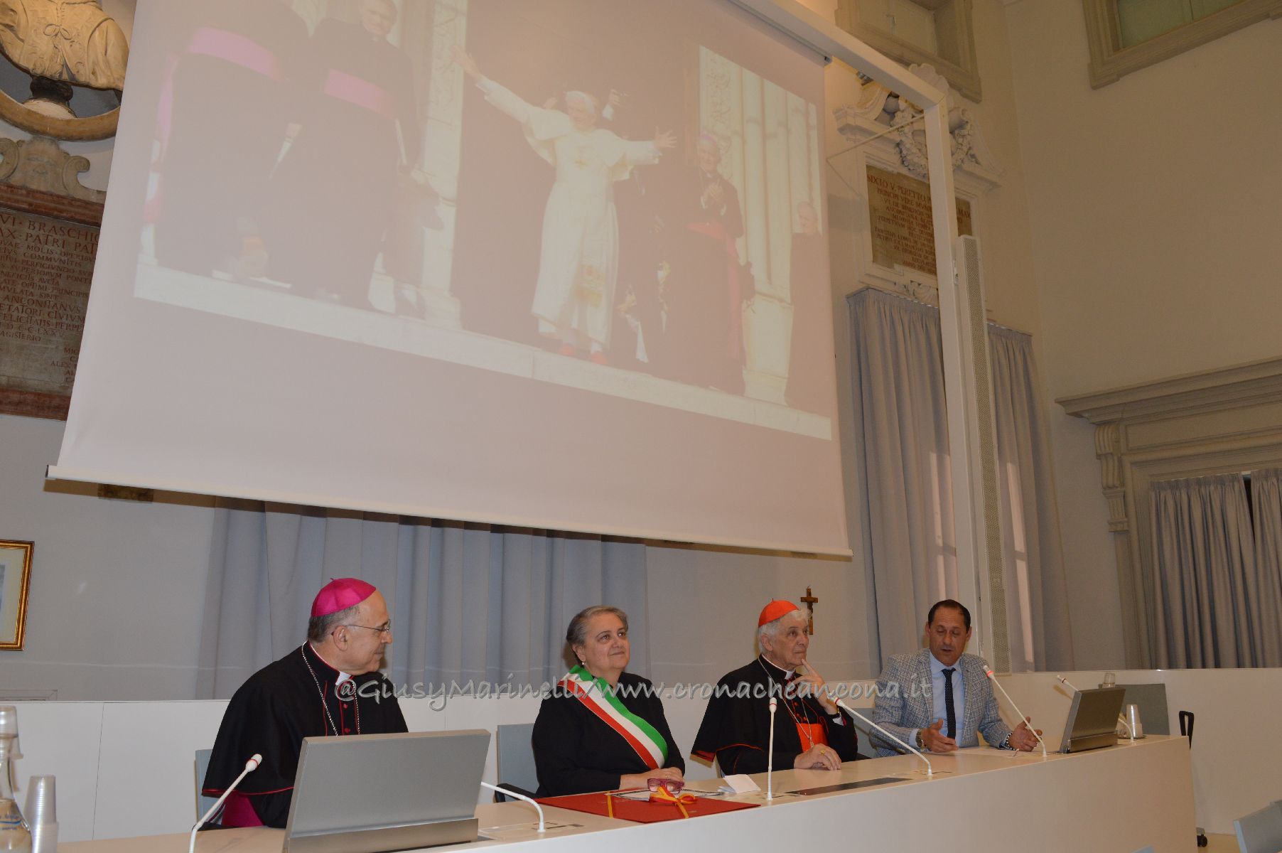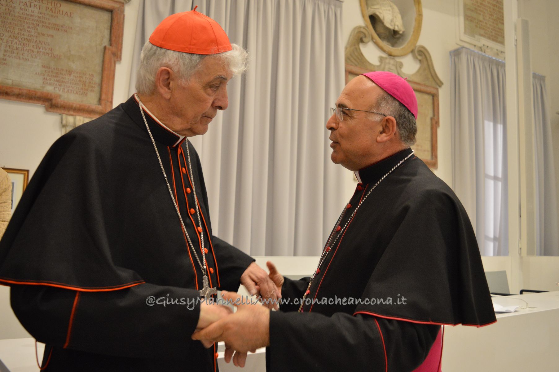 Don Edoardo, come lo chiama il sindaco Mancinelli, ci tiene a citare tre momenti dei suoi 13 anni di episcopato. Tre momenti simbolo che rappresentano l’apertura verso gli altri, la dignità del lavoro e la carità. Tre insegnamenti, che il vescovo emerito porta in dona per ringraziare della cittadinanza conferita. Da oggi il cardinale Edoardo Menichelli è cittadino onorario di Ancona. “Non conoscevo Ancona. Ho scoperto una città che accoglie nella sua rete di amicizia e simpatia. Una città con tanti segni di solidarietà. Ringrazio di avermi fatto entrare in modo stabile nella sua storia, lo faccio con gioia e senso di responsabilità”. Nel pomeriggio a Palazzo degli Anziani si è tenuta la cerimonia di conferimento della cittadinanza da parte del sindaco, che ha raccolto la proposta approvata all’unanimità dal Consiglio comunale, alla presenza dell’arcivescovo monsignor Angelo Spina e delle autorità, tra cui il sindaco di San Severino, città natale di Menichelli. Sul maxi schermo della sala consiliare scorrono alcuni scatti che riassumono i 13 anni che dal 2004 al 2017 hanno reso Menichelli un anconetano a tutti gli effetti. Campeggia su tutti la visita di Papa Benedetto XVI per il Congresso Eucaristico. Un evento che “Ancona non vedrà mai più”, sottolinea Menichelli. Erano i giorni caldi della crisi Fincantieri del 2011, Menichelli ricorda l’intuizione di svolgere la messa con il Santo Padre proprio nell’area del cantiere, presenti gli operai, con tanto di striscione affisso al Duomo e l’ad Fincantieri Bono tra le autorità. Sarebbe diventato il Congresso Eucaristico del lavoro, con i lavoratori e i poveri invitati al pranzo con il Papa.