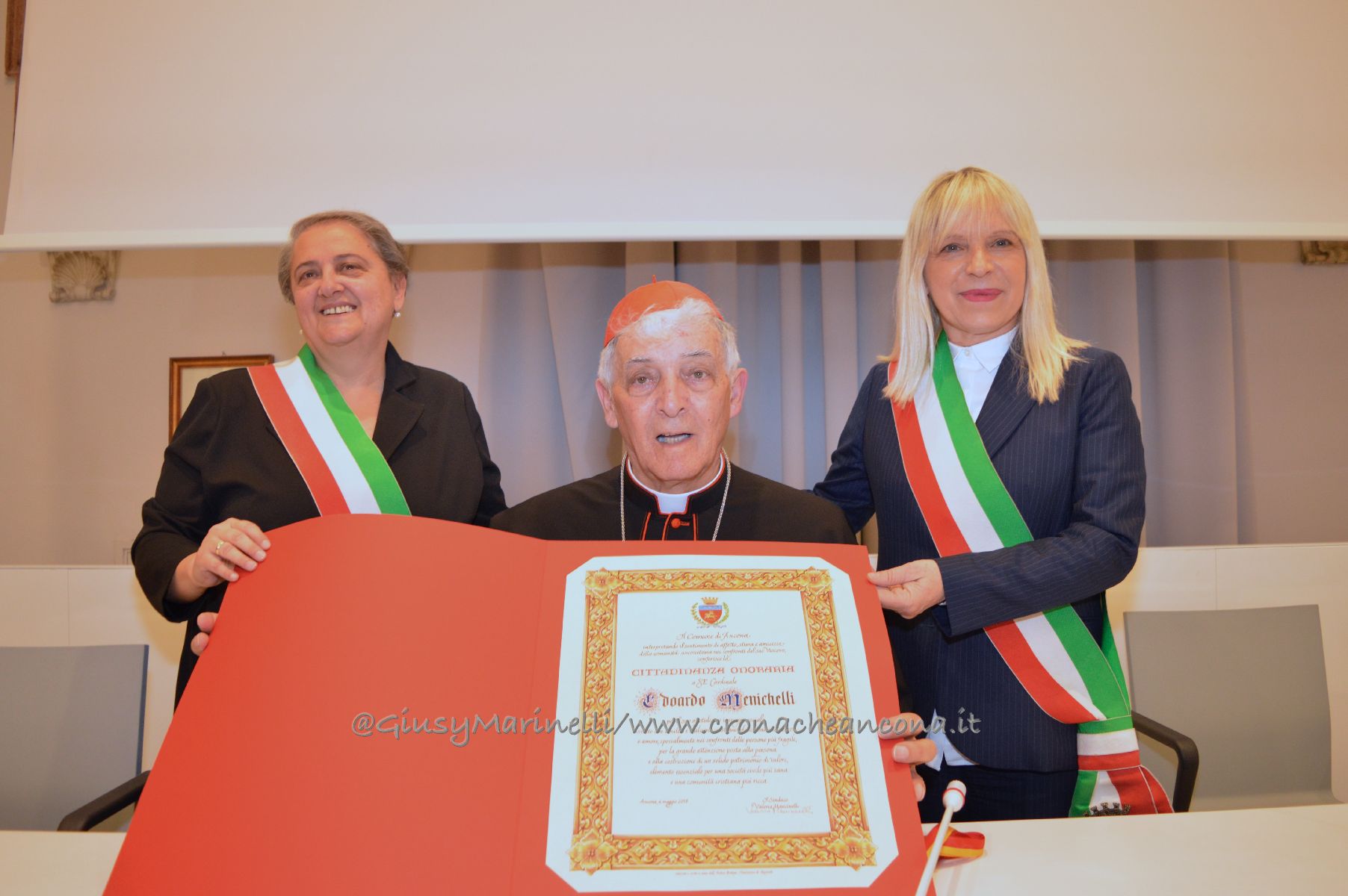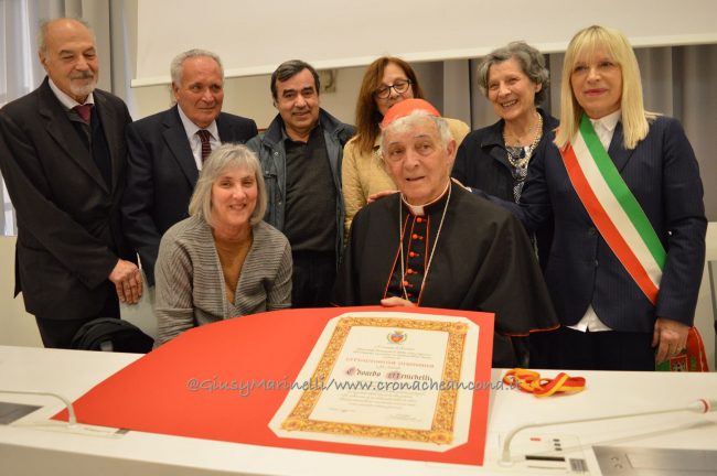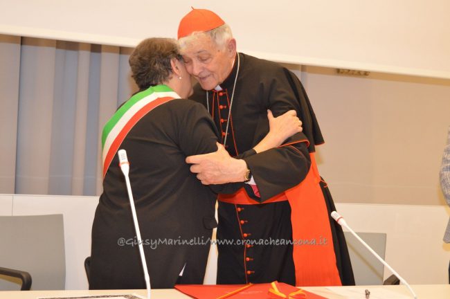 “Non passava giorno senza che gli operai sfilassero sotto le mie finestre e io ho camminato con loro per chiedere risposte. Non potevo essere spettatore insensibile. Oggi mi dicono che Fincantieri ha commesse. Fortuna? Furbizia? Vi dico: quando dovete fare qualcosa di importante, abbandonate un po’ di prudenza, e affidatevi di più alla provvidenza” ha ricordato con una punta di ironia Menichelli. Altro momento che il cardinale ha voluto ricordare è stato l’invito, dell’allora sindaco Sturani, di presentarsi all’Anpi, per la camera ardente del comandante Ferro, Emilio Ferretti nel 2007. Il partigiano simbolo, che nemmeno aveva voluto il funerale religioso. Davvero inusuale allora vedere arrivare l’arcivescovo alla sede di via Palestro. “Mi ha aperto una storia, e la città si è aperta nei miei confronti. Quando incontri le persone non devi chiedere la carta d’identità” ha spiegato Menichelli. Infine, la carità e la solidarietà. “Ancona è una città con tanti segni di solidarietà, tante associazioni” sottolinea il cardinale, che non ha mancato di ricordare quando nel 2014 si aprì il dibattito sul trasferimento della mensa di Padre Guido dal centro. “A chi me lo chiese dissi: dovete passare su di me per spostare la mensa”. “Il conferimento della cittadinanza non è un passaggio formale, né retorico, ma un gesto dei più veri per riconoscere l’empatia della città nei confronti di don Edoardo” ha commentato il sindaco Valeria Mancinelli. “Al mio ingresso in diocesi ho detto a sua eminenza che non avrebbe nemmeno dovuto bussare, perché questa è casa sua. Mi rende felice vedere questo comune sentire anche da parte delle autorità civili” ha aggiunto l’arcivescovo Angelo Spina.