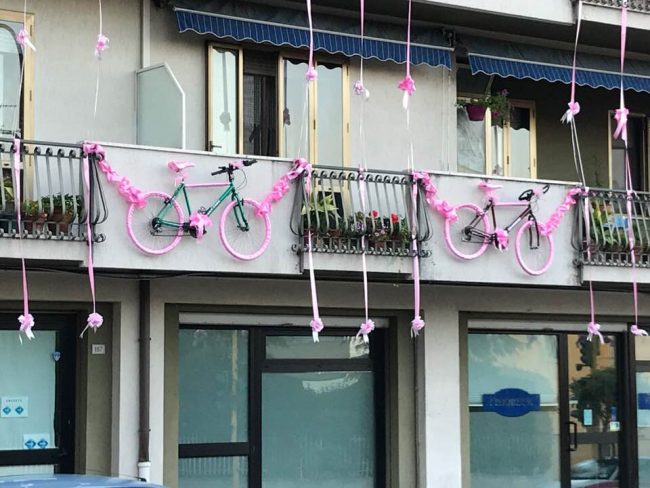 Giro d’Italia, un condominio di via Guazzatore con addobbi ispirati alla carovana rosa (foto Bruno Severini)