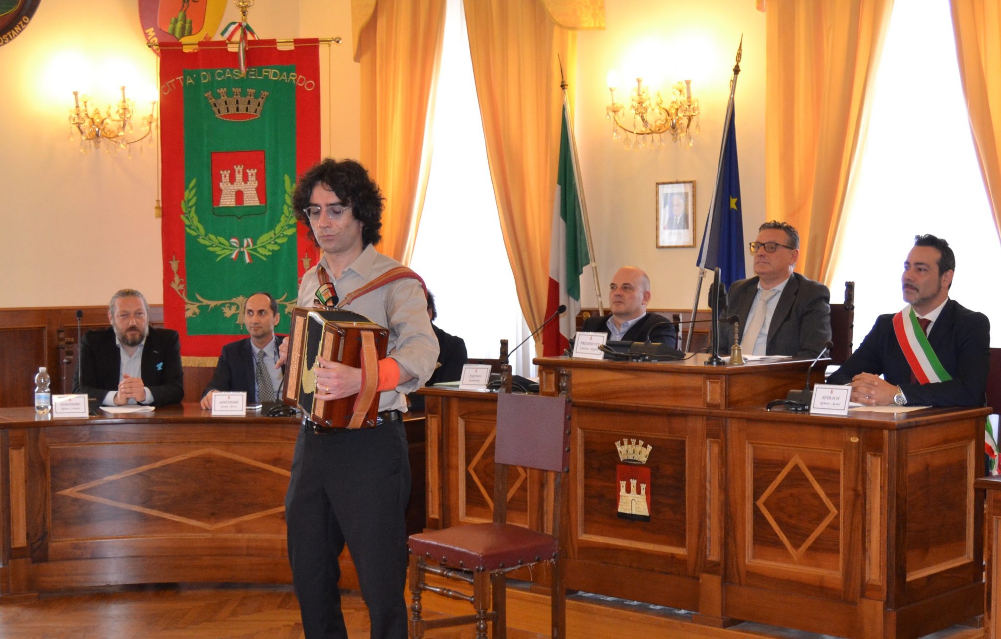 La musica è invece la cifra di Tommaso Speciale, enfant prodige di 11 anni allievo della civica scuola di musica “Soprani” e del maestro Emiliano Giaccaglia, che si è aggiudicato il Primo premio assoluto al Concorso Internazionale “Coppa Pianisti” di Osimo e al Concorso pianistico Internazionale Città di Spoleto. Premiata anche la Tenax Calcio a 5 per la promozione in serie A2, di cui il vice-presidente Carlo Castorina ha espresso l’auspicio di esserne all’altezza, sottolineando come “il progresso si misuri anche dai risultati di una squadra a trazione locale”. Ad un emozionato ambasciatore della fisarmonica, il maestro Roberto Lucanero, musicista ed etnomusicologo, organettista, suonatore di organo portativo medievale, compositore, saggista e didatta che sta crescendo una nuova generazione di artisti, l’onore di rappresentare l’immagine di qualità di Castelfidardo nel mondo e quello di concludere in note la bella cerimonia con una dirompente esibizione che compendia il patrimonio di sonorità, cultura e tradizioni popolari della fisarmonica diatonica.