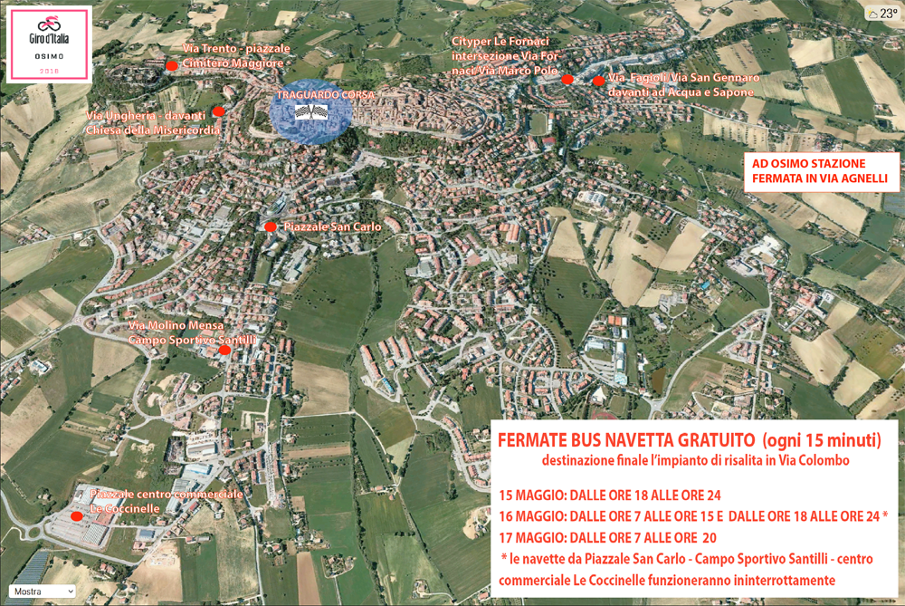 Chi vuole assistere allo spettacolo, mercoledì dovrà arrivare ad Osimo per tempo, altrimenti rischierà di perdere il suo posto in prima fila. Il Giro d’Italia è considerato alla stregua dei grandi eventi ed il dispositivo di sicurezza, pur modulare, prevede tempi serrati per accessi e movimenti di mezzi e persone. Sono attesi decine di migliaia di spettatori per il 16 e 17 maggio, almeno 10mila, basti pensare che oltre alla carovana rosa con le ammiraglie in città 2 ore prima dei ciclisti, solo 2500 persone sono al seguito dell’organizzazione Rcs. Tutti alloggeranno in alberghi di Osimo e Filottrano ma anche di Senigallia, Civitanova Marche, Macerata, Montelupone e Potenza Picena. Si farà spazio anche agli autobus di pendolari partiti da fuori regione. Perfino un gruppo di 50 canadesi in vacanza a Rimini, appassionati di ciclismo, scenderà dalla corriera a Osimo Stazione per risalire in bici pedalando fino al centro storico dove assistere all’arrivo della tappa Assisi-Osimo. Tra gli ospiti del sindaco Simone Pugnaloni è stata poi inclusa una delegazioni di Copertino, città gemellata con Osimo. “Per gli amanti del ciclismo che arrivano da fuori città o addirittura da fuori regione, il parcheggio per lasciare il proprio mezzo e salire sulle navette è a Osimo Stazione in via Agnelli, vicino all’uscita dell’A 14 – stamattina in conferenza stampa è stato l’appello del sindaco di Osimo– Altre aree di interesse della manifestazione sportiva sono l’Open Village allestito alla Sacra Famiglia e l’area sosta per i pullman sistemata in via Vescovara. Siamo pronti per il Giro d’Italia. E’ stato un bellissimo lavoro di squadra. Il Coc e l’area interforze sarà sempre attivi a palazzo comunale”.