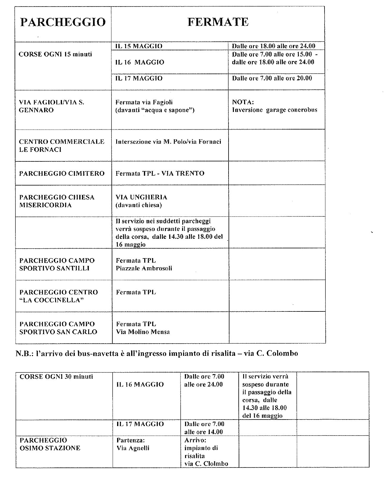 I PARCHEGGI – I parcheggi stellari individuati nella periferia osimana, con circa 500 posti disponibili, potranno essere utilizzati sia dai residenti del centro storico che dai visitatori. Nel versante sud è stata riservata a loro l’area sosta della Misericordia, del cimitero maggiore, in quella ovest il posteggio del San Carlo e del centro commerciale Coccinella, nel versante nord, quelli del Palabellini, del Cityper di via Vecchia Fornace e di ‘Acqua e Sapone’ in via San Gennaro. Le navette della Tpl passeranno ogni quarto d’ora per condurre i visitatori al Tiramisù collegato alle piazze centrali. Dalle 14 alle 17 di mercoledì transiterà però solo quella diretta ai parcheggi San Carlo, Molino Mensa e centro commerciale Coccinella. Passerà inoltre ogni 20 minuti anche la navetta di Osimo Servizi dal parcheggio di via Agnelli, a Osimo Stazione.