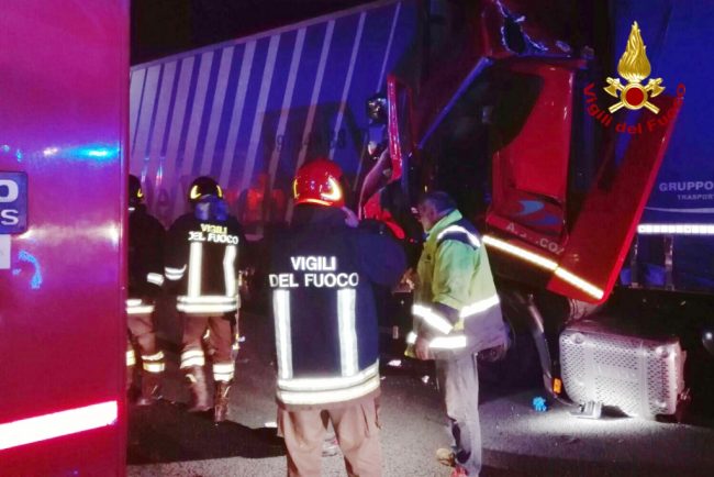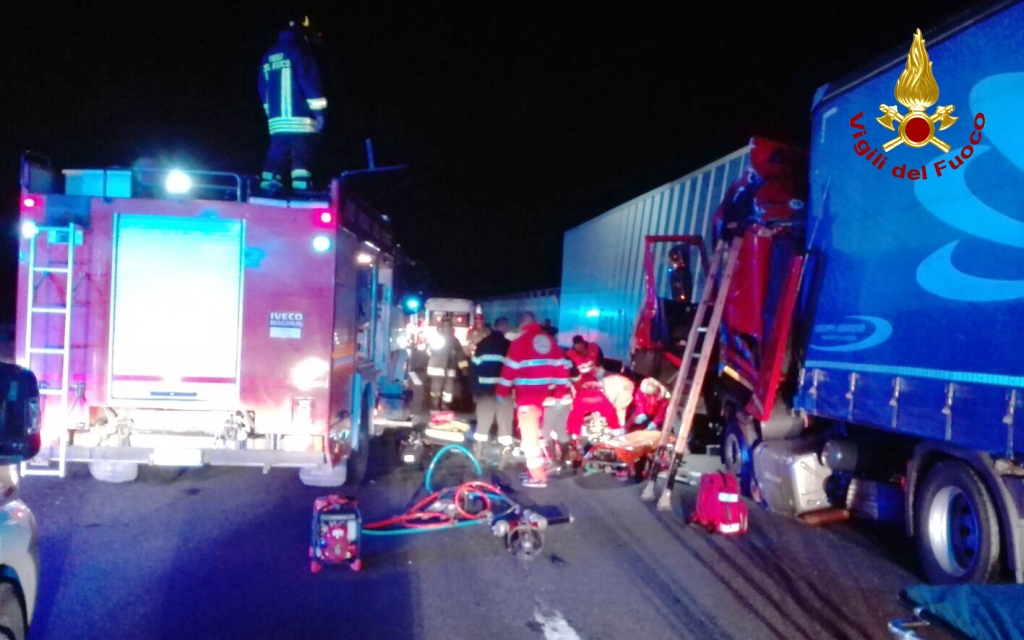 L’ispezione cadaverica, eseguita stamattina all’obitorio dell’ospedale di Civitanova Marche, ha confermato che P.S., il camionista greco di 40 anni, è morto a seguito dei traumi riportati nell’incidente stradale di ieri sera sull’A14. L’uomo stava scendendo dal suo Tir con targa bulgara e carico di frutta, dopo essere stato tamponato da un secondo autoarticolato sulla corsia nord, al km 242+200, sul territorio di Porto Recanati tra i caselli di Loreto e Ancona Sud, quando è stato investito da un Peugeot Partner a bordo del quale viaggiavano 4 operai abruzzesi diretti al lavoro nel cantiere dell’ex ospedale Umberto I di Ancona. Per lui non c’è stato nulla da fare nonostante i tentativi di rianimazione dei sanitari del 118. Il compagno di viaggio è rimasto illeso, mentre l’altro camionista, M.F., 51enne di Savona, e i 4 occupanti della vettura sono stati trasportati all’ospedale di Torrette. Qui resta ancora ricoverato, ma non in prognosi riservata, l’autotrasportatore ligure che ha tamponato il camion con i due autisti greci a bordo che stava rientrando in carreggiata dopo una sosta su una piazzola. Il 51enne è rimasto incastrato tra le lamiere dell’abitacolo del tir, ed è stato estratto dopo un lungo lavoro di taglio termico dai vigili del fuoco. Durante le operazioni di soccorso la corsia nord è rimasta chiusa tra i caselli del tratto interessato dall’incidente.