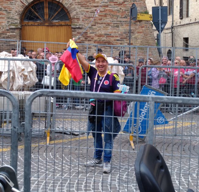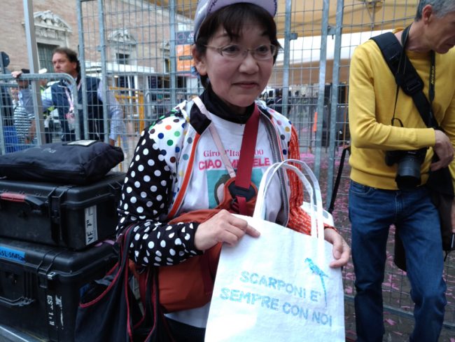 Tra gli oltre 10mila spettatori che hanno invaso Osimo, oggi pomeriggio c’erano anche diversi stranieri arrivati in città per seguire il Giro d’Italia, come il colombiano tifoso di Esteban Chaves e la signora Kanai, una fan di Michele Scarponi che vive nel Paese del Sol Levante. Per seguire la 16° tappa del Giro Rosa, si è fermata ad Osimo con un gruppo di 5 amici partiti da Kochi, città dello Shikoku, la più piccola tra le isole principali del Giappone. Stasera sarà ospite di Anna Tommasi e della famiglia Scarponi a Filottrano. A loro consegnerà un fondo di beneficenza per la fondazione intitolata al campione scomparso un anno fa nel tragico incidente stradale. Kanai donerà anche una borsetta di carta filigrana giapponese su cui spicca l’origami di un’aquila o forse di Frankie, il pappagallo amico di allenamenti del ciclista. “Anche nella nostra città, lo scorso mese, ci sono stati due ciclisti vittime delle strada.- racconta- Voglio sensibilizzare il pubblico a questo gravoso problema, sostenendo la Fondazione Scarponi che già lo fa”.
