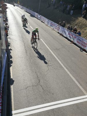 A cinque giri dal termine il primo rimescolamento. Da dietro arrivano Samuele Rivi (che passa per primo al GPM) insieme a Gabriele Denaro, Bedeschi e Tagliani che vanno a sostituirsi a Marchetti e Baseggio che perdono metri. La fuga iniziale è azzerata con il gruppo di nuovo unito. Al 2° GPM passa per primo Logica, poi Zilio e terzo Samuele Rivi che ottiene il titolo. A 37 km dall’arrivo Nicolò Rocchi, Luca Colnaghi e Federico Sartor fanno di nuovo selezione prendendo un vantaggio di 22’’. Transitano nell’ordine a S. Agostino quando mancano 25 chilometri all’arrivo. Da dietro, a 20” si fa vedere Samuele Battistella. Ricongiungimento che arriva all’Acquaviva.