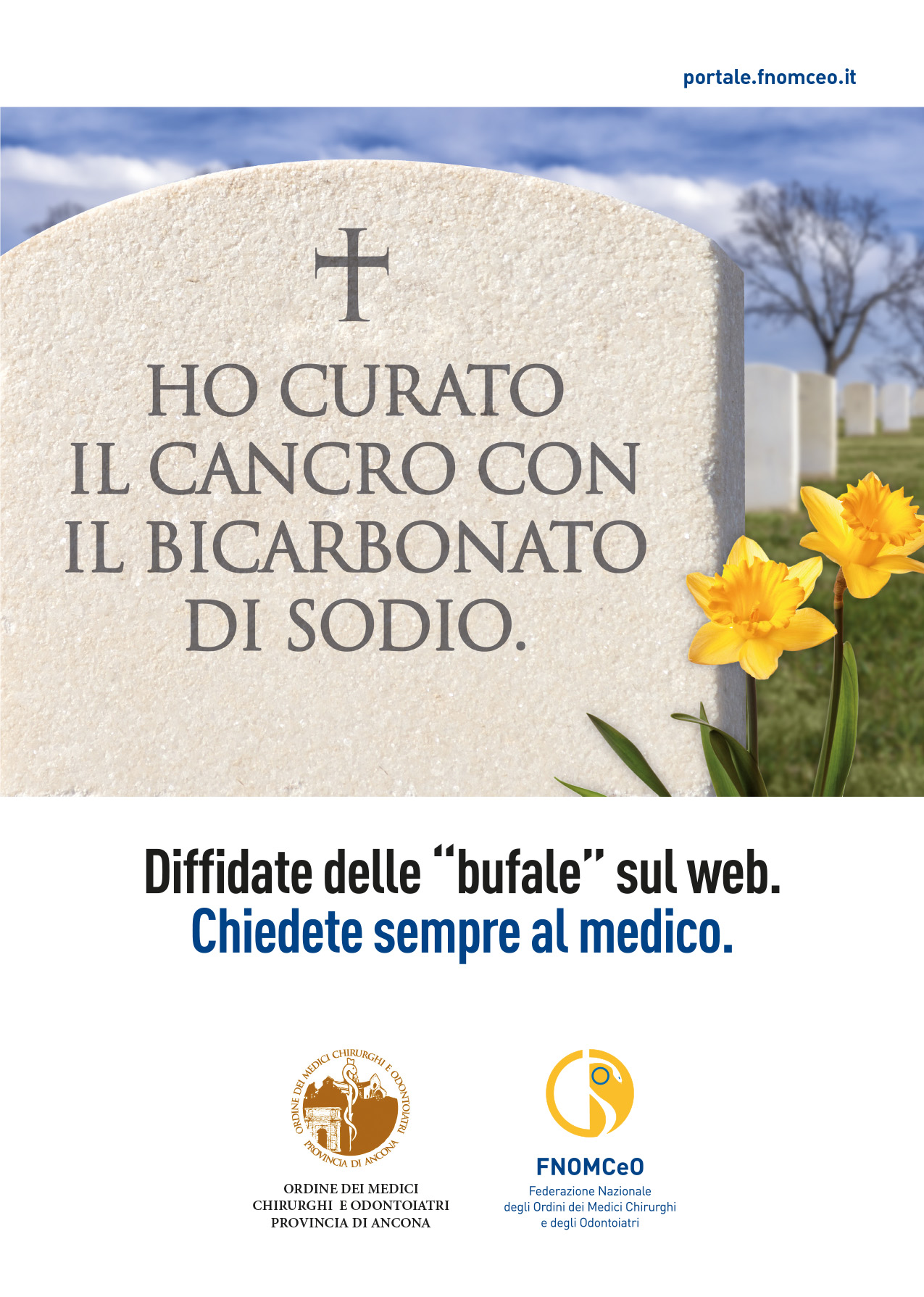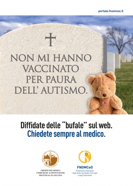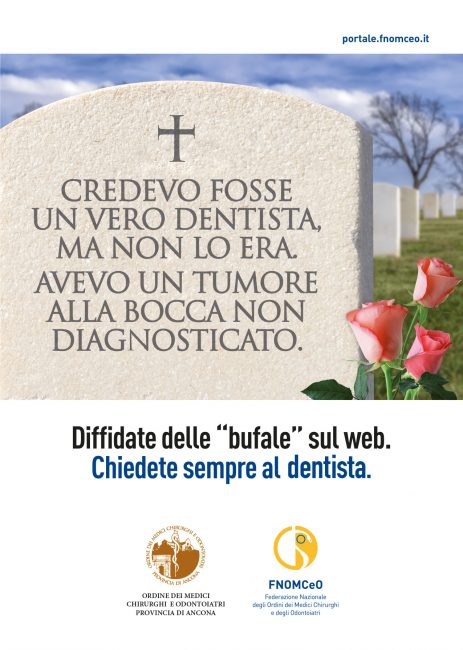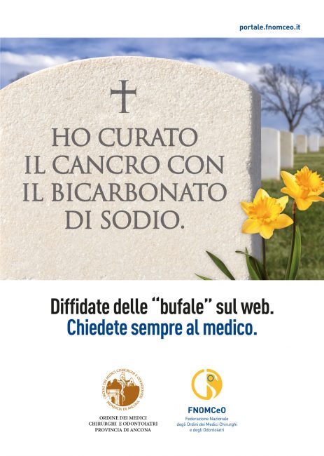 Epitaffi choc sui manifesti affissi in tutta la città, è la campagna anti bufale scelta dall’ordine dei medici chirurghi e odontoiatri della provincia di Ancona, tra i primi in Italia ad aderire alla campagna anti fake news promossa dalla Federazione Nazionale Ordini dei Medici e Chirurghi Odontoiatri (Fnomceo). Anche nel capoluogo dorico sono comparsi i manifesti realizzati affermare l’importanza dei professionisti della salute contro il ricorso alle cure “fai da te” via internet. “Di fronte al dilagare crescente della disinformazione e della deriva antiscientifica che stiamo vivendo in questo momento storico – commenta Fulvio Borromei, Presidente Omceo Ancona – Abbiamo sentito anche noi come Ordine la necessità di dare un segnale forte e chiaro: la tutela della salute non può prescindere dal rapporto con i professionisti della medicina. Affidandosi a ciò che circola nel web o, peggio ancora, credendo in modo acritico a tutto ciò che si sente dire, si mette seriamente in pericolo la propria salute e anche, come nel caso dei vaccini, quella dei propri figli e della comunità intera: il medico deve ritornare al centro della relazione che il paziente ha con la propria salute”.
