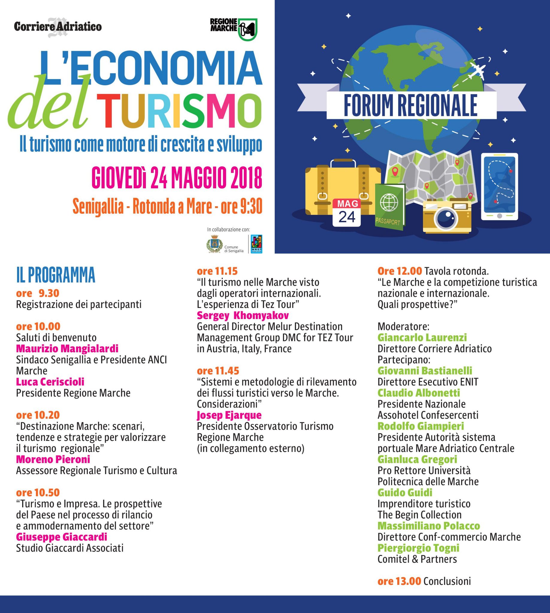 La Rotonda a Mare di Senigallia ospiterà giovedì 24 maggio il forum regionale “L’Economia del turismo”, organizzato dalla Regione Marche e dal Corriere Adriatico, in collaborazione con il Comune di Senigallia e l’Anci Marche. I lavori prenderanno avvio alle ore 10 con i saluti di benvenuto del sindaco e presidente Anci Marche Maurizio Mangialardi e del presidente della Regione Marche Luca Ceriscioli. A seguire gli interventi dell’assessore regionale al Turismo Moreno Pieroni (“Destinazione Marche: scenari, tendenze e strategie per valorizzare il turismo regionale”), di Giuseppe Giaccardi, dello Studio Giaccardi Associati (“Turismo e Impresa. Le prospettive del Paese nel processo di rilancio e ammodernamento del settore”), di Sergey Khomyakov, General Director Melur Destination Management Group Dmc for Tez Tour (“Il turismo nelle Marche visto dagli operatori internazionali. L’esperienza di Tez Tour”), e di Josep Ejarque, presidente dell’Osservatorio Turismo della Regione Marche (“Sistemi e metodologie di rilevamento dei flussi turistici verso le Marche”).