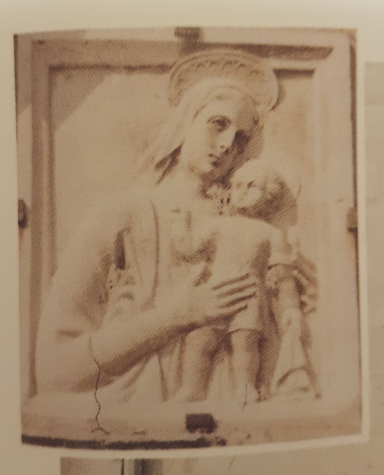 Il bassorilievo in pietra che raffigura la Madonna col Bambino, del XVII secolo, presente sulla facciata