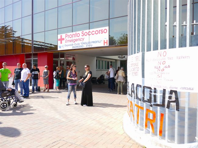 Il Coordinamento cittadino per la salvaguardia del punto nascita e la difesa dell’ospedale, il Forum regionale in difesa della sanità, il Comitato Sveglia Fabrianesi, singoli cittadini, tutti in presidio stamattina davanti l’ospedale per la protesta indetta dall’associazione Fabriano Progressista per scongiurare la chiusura tramite depotenziamento del reparto di Pediatria del Profili. A rischio secondo gli organizzatori del sit-in sarebbe il reparto di Pediatria che dal prossimo 31 maggio si troverebbe con un solo medico, non in grado di coprire guardie e reperibilità, mettendo a rischio anche il punto nascita. Per l’ospedale vige l’Afoi, cioè un accordo con gli Ospedali Riuniti di Torrette che prevede la condivisione del personale medico specializzato. Ma con il personale ridotto all’osso, i pensionamenti non sostituiti, l’Afoi non basta. “Ci troviamo da capo, come prima delle promesse elettorali”, ha detto il dottor Arteconi, dell’associazione Fabriano Progressista.