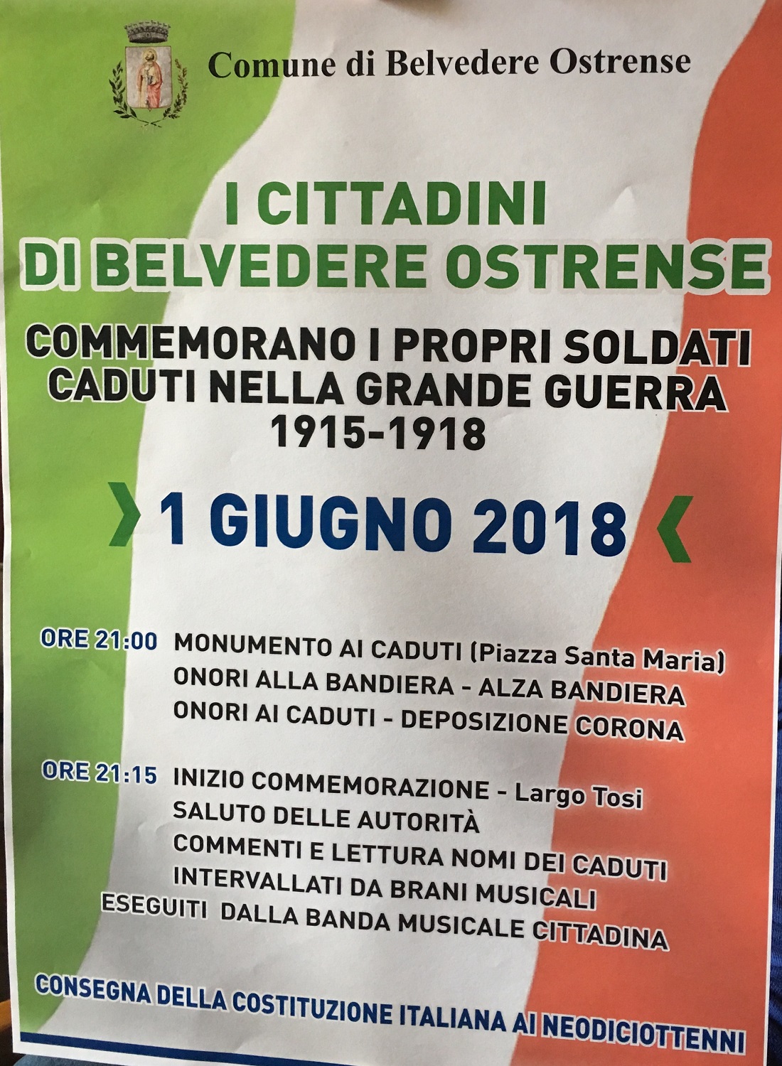 Belvedere Ostrense commemora i propri soldati caduti nella Grande Guerra 1915-1918. L’iniziativa, promossa dall’Amministrazione Comunale, si terrà venerdì 1 giugno a partire dalle ore 21. Nell’occasione verrà consegnata anche una copia della Costituzione a tutti i neo maggiorenni. L’appuntamento è presso il Monumento ai Caduti, in piazza Santa Maria, per gli onori alla bandiera e ai caduti con la deposizione di una corona. Subito dopo, in via Largo Tosi, inizierà la commemorazione con il saluto delle autorità civili e religiose, alla presenza del sindaco Riccardo Piccioni. Verranno ricordati uno ad uno i nomi di tutti i soldati belvederesi caduti durante la Prima Guerra Mondiale alternando brani musicali eseguiti dalla Banda Cittadina. A fine cerimonia il sindaco consegnerà a tutti i neo maggiorenni una copia della Costituzione Italiana. “L’iniziativa rappresenta un momento simbolico importante -spiega il sindaco Riccardo Piccioni- il raggiungimento della maggiore età coincide anche con il pieno conseguimento dei diritti di cittadinanza, compresi il diritto di voto. Un valore rafforzato proprio dalla consegna della Costituzione”.