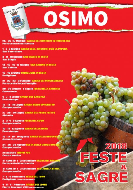 Saranno 18 e non 19, quest’anno, le sagre osimane in calendario per l’estate 2018. All’appello infatti manca quella di ‘San Biagio in festa’. Il presidente delle Acli si è dimesso a gennaio e non è stato ancora nominato il suo successore e all’ultimo momento, nonostante che fosse già stata inserita nel cartellone, si è preferito non organizzarla. Dopo la ‘Sagra del coniglio in porchetta’, organizzata per la prima volta quest’anno, che lo scorso week end ha aperto i giochi alla Misericordia, questo fine settimana sarà la volta di San Paterniano con la ‘Sagra degli gnocchi con la papera’. Dal 14 al 17 giugno sarà protagonista ‘San Sabino in festa’, il 15 e 16 ‘Padiglione in festa’, mentre dal 21 al 24 tornerà la ‘Sagra dei vicisgrassi’ organizzata dalla parocchia della Sacra Famiglia. Dal 29 al 30 la tradizionale ‘Festa della Sagria’ di Casenuiove. Apre il mese di luglio, dal 6 all’8, la ‘Sagra del baccalà’ di Passatempo che lascerà il passo dal 13 al 15 alla ‘Sagra dello spaghetto’ di Campocavallo e a quella del pesce fritto all’Abbadia dal 27 al 29. Dal 2 al 5 agosto sarà la volta della ‘Festa del Covo’ di Campocavallo e dal 10 al 12 a Passatempo la ‘Sagra della rana’. Dal 16 al 19 sarà sotto i riflettori Osimo Stazione con la ‘Sagra della bruschetta’. La festa della Croce Rossa a Campocavallo sarà di scena dal 24 al 26 agosto mentre il 25 sfileranno i figuranti di Rivivi ‘700 con le taverne gastronomiche aperte in centro storico. Dal 30 agosto al 2 settembre chiuderanno la rassegna estiva la ‘Sagra del fagiolo’ alla parrocchia della Misericordia e la ‘Festa della birra’ a Campocavallo, seguite dalla ‘Festa del Toro’ di Padiglione dal 7 al 9 settembre. Fanalino di coda la ‘Festa del Leone di San Marco’, dal 4 al 7 ottobre.