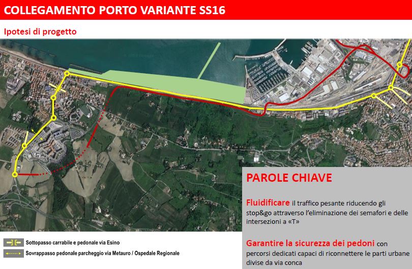 Variante Nord. Ecco il tracciato ipotizzato da Comune e Anas, ora allo studio di prefattibilità. Due corsie di 10,5 metri di larghezza della carreggiata per un percorso di 3,5 chilometri, di cui due tratti in galleria e un tratto in viadotto, per un costo stimato nell’ordine di 110 milioni di euro. Circa un quarto del costo della ormai cestinata Uscita Ovest, che avrebbe dovuto correre in galleria dalla Palombella fino al casello autostradale di Casine di Paterno. Se l’Uscita Ovest si reggeva su un pedaggio, questa “variante di ultimo miglio” sarà una strada statale a tutti gli effetti, senza ticket e a carico dell’Anas per realizzazione e manutenzione. Da via Mattei e bypass della Palombella, la variante correrà parallela lungo via Flaminia, fino all’altezza del concessionario Bartoletti. Qui entrerà in “trincea”, per piegare verso Torrette ed entrare in un vero e proprio tunnel sotto via Grotte, riemergere, costeggiare l’area dell’ospedale regionale, affrontare una seconda galleria e quindi tornare alla luce su un viadotto che porterà la strada a raso all’innesto di una nuova rotatoria nel tratto finale di via Conca, allo svincolo con la statale 16. Il bypass della Palombella potrà essere adeguato per diventare uno snodo tra la viabilità urbana e la “camionabile”. I tempi? Ancora lunghi e impossibili da prevedere: oltre alla fattibilità, l’opera dovrà essere soggetta a valutazione di impatto ambientale e poi finanziata. “Ma non abbiamo dubbi che saranno rispettati gli impegni, è stato firmato un contratto di programma con Rfi e lo Stato, che garantisce le opere di difesa a mare dell’intervento. Questi progetti si basano su una serie di occasioni e convenienze che ne rendono possibile la realizzazione” ribadisce Manarini.
