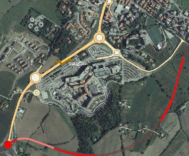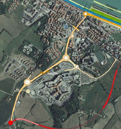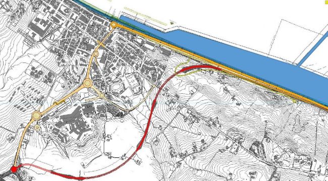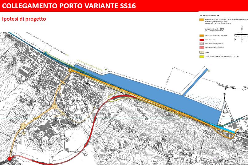 In rosso il tracciato della variante nord , in giallo la normale viabilità urbana. In verde l’area interrata con il lungomare nord