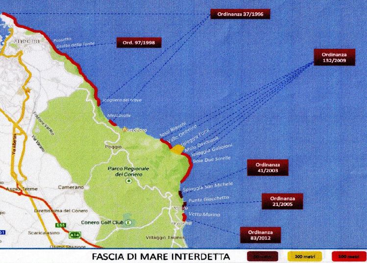 Si va da Ancona, dal monte Cardeto fino al Trave, quindi tra Mezzavalle e Portonovo, a Sirolo tra la spiaggia dei Sassi Bianchi fino a quella dei Forni, poi il divieto si allarga e diventa fascia gialla (mare interdetto fino a 300 metri dalla costa) nell’intera spiaggia dei Forni, e torna l’interdizione fino a 100 metri dalla costa dal molo Davanzali lungo tutta la falesia del monte Conero, fino al limite con la spiaggia dei Sassi Neri. Infine quinto tratto vietato entro 100 metri dalla costa a Numana, vetta Marina. Massima restrizione (divieto di avvicinarsi a 50 metri dalla costa), lungo la spiaggia di San Michele a Sirolo e Punta Giacchetta.