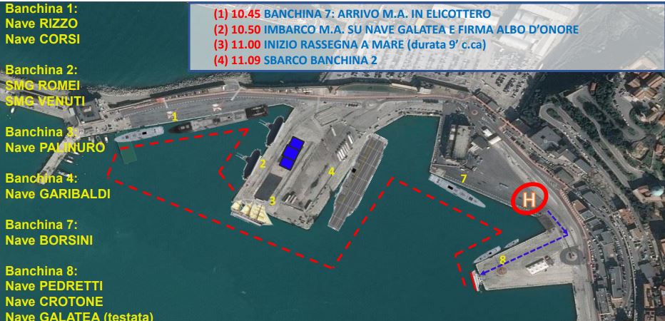In rosso l’itinerario della rassegna in mare del presidente della Repubblica, in blu il palco delle autorità allestito al Molo Rizzo